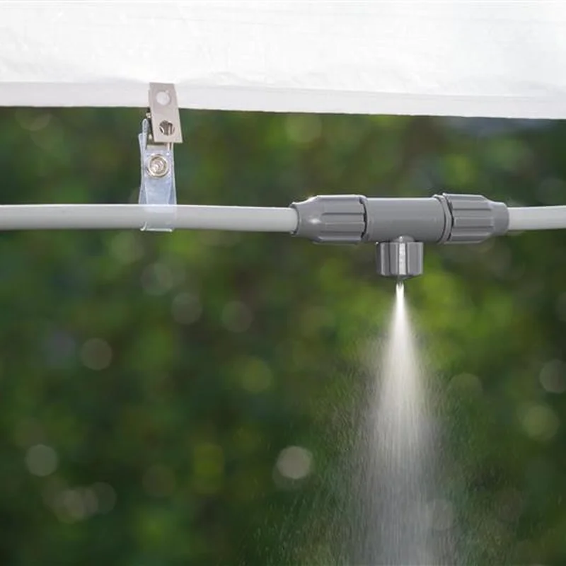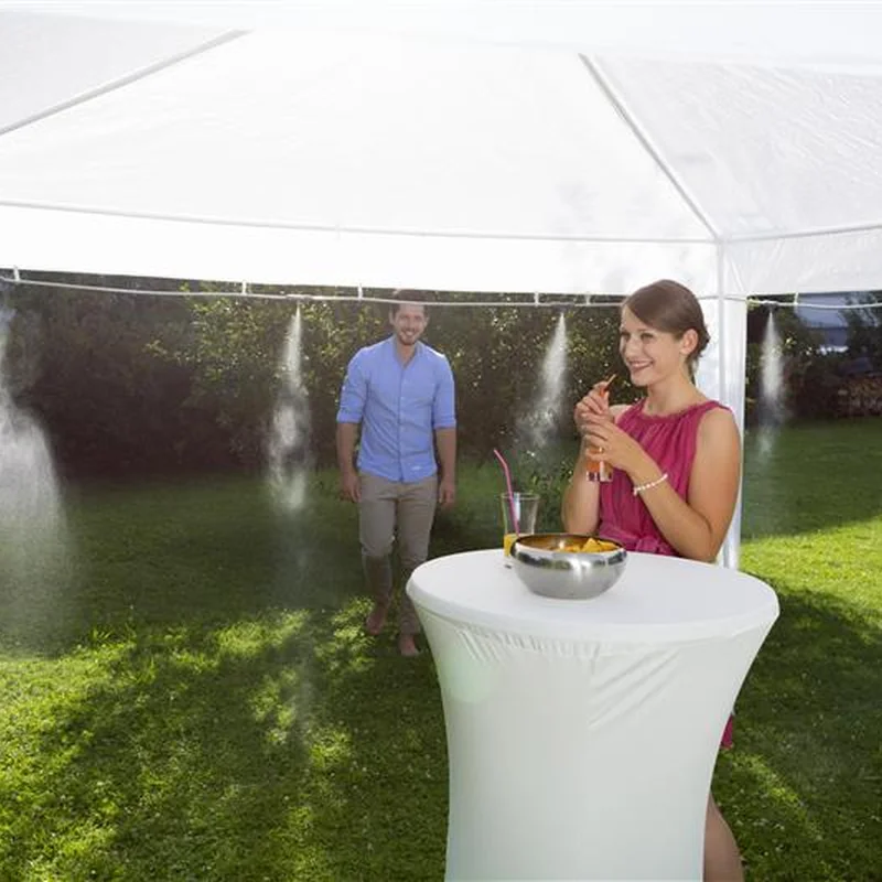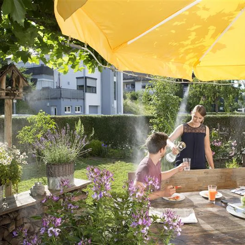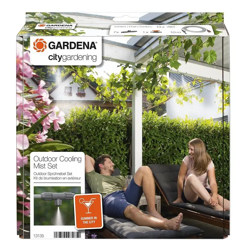 Набір для створення дрібнодисперсного туману GARDENA MicroMist допоможе Вам охолонути на вулиці у спекотні дні. Форсунки створюють дрібний туман, який робить навколишнє повітря приємно прохолодним, охолоджуючи довкілля на 1…6 градусів. Вода настільки дрібно розпилюється, що висить у повітрі, як прохолодна вуаль. Завдяки зручним і практичним у використанні монтажним затискачам нібулайзер GARDENA є дуже гнучким у застосуванні. Система із форсунками для дрібнодисперсного розпилення просто прикріплюється до тенту або намету, на балконі або у внутрішньому дворику, та підключається до водопровідного крану за допомогою вбудованого з’єднувача. За потреби затискачі швидко знімаються, а нібулайзер можна встановити у іншому місці. Якщо нібулайзер монтується на постійній основі (наприклад, на альтанці), монтажні затискачі також можна легко зафіксувати гвинтами. В процесі функціонування розхід води становить до 13 л/год. Набір складається з 10–метрового шланга внутрішнього діаметра 3,5 мм, 7 форсунок для дрібнодисперсного розпилення, 1 регулюючого клапана, 13 затискачів для кріплення і конектора для шланга та одразу ж готовий до використання і може бути модифікований додатковими елементами.