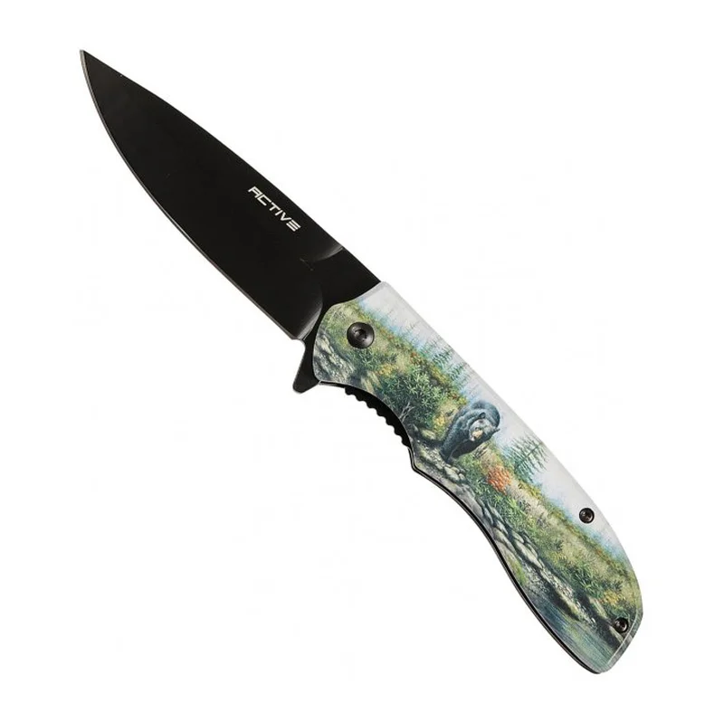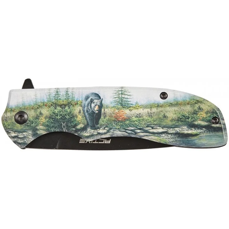 Руків'я зручною форми, прекрасно лежить в руці, має накладки з алюмінію з чорним покриттям, на одній з яких - кольорове зображення ведмедя породи Кодьяк. У складеному вигляді ніж носиться в положенні tip-down на односторонній кліпсі.