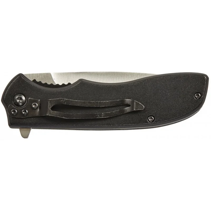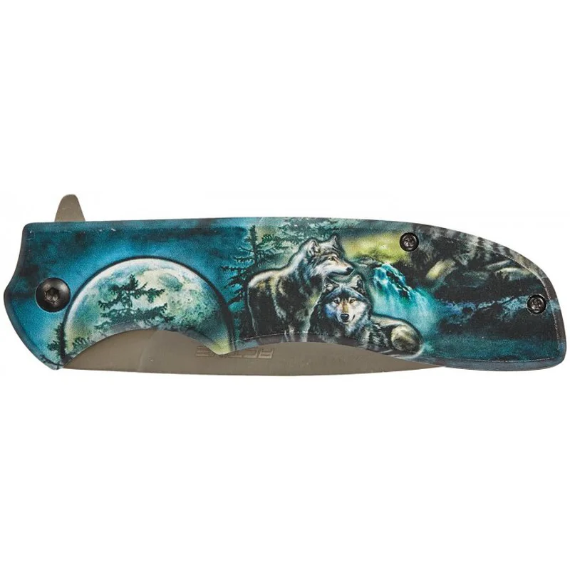 Руків'я зручною форми, прекрасно лежить в руці, має накладки з алюмінію з чорним покриттям, на одній з яких кольорове зображення пари вовків на тлі повного місяця і лісового водоспаду. У складеному вигляді ніж носиться в положенні tip-down на односторонній кліпсі.