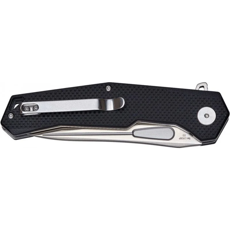 Клинок виготовлений з високоміцної сталі D2, оброблений за технологією Satinpolish. Дана сталь має ступінь твердості 58-60 HRC і відмінно тримає заточку. Для швидкого і легкого вилучення клинка передбачений шарикопідшипниковий механізм.