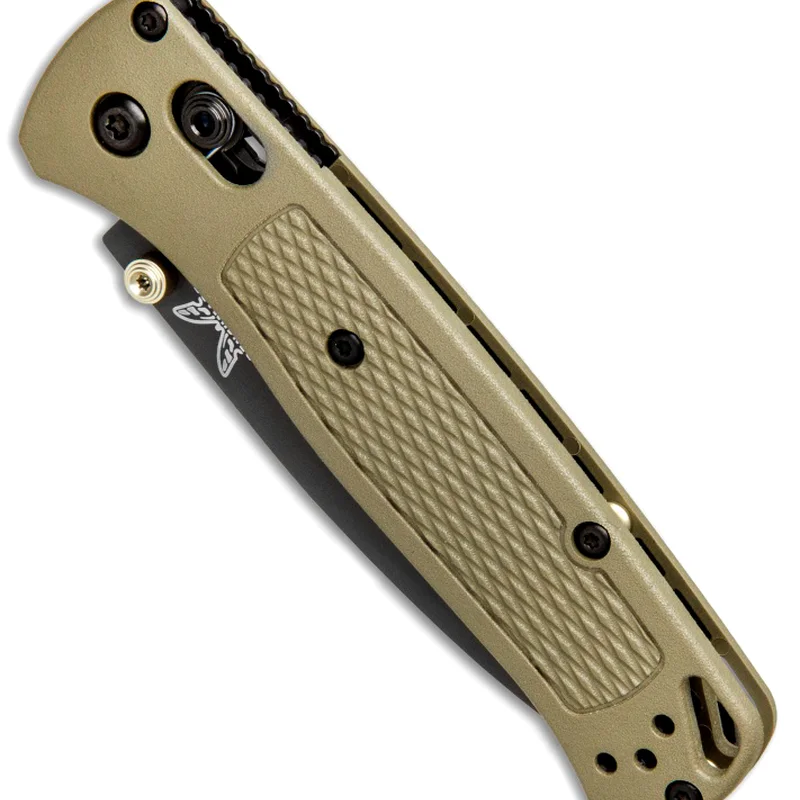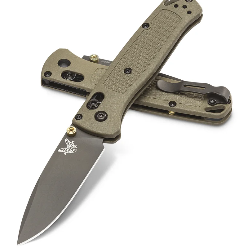 Розкриття ножа проводиться за допомогою двостороннього анодованого в блакитний колір шпенька, а надійну фіксацію забезпечує розроблений і запатентований компанією Benchmade замок AXIS. Зручна рукоять блакитного кольору з полімеру Grivory здатна витримувати високі температури і володіє великою міцністю. Плашки текстуровані для кращого захоплення при роботі. Крім того, ніж буде зручний як правшам, так і лівшам, тому що виробник дає можливість переставляти кліпсу. Як доповнення в підставі рукояті розташоване досить великий отвір для темляка.