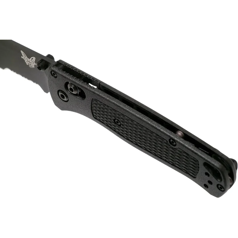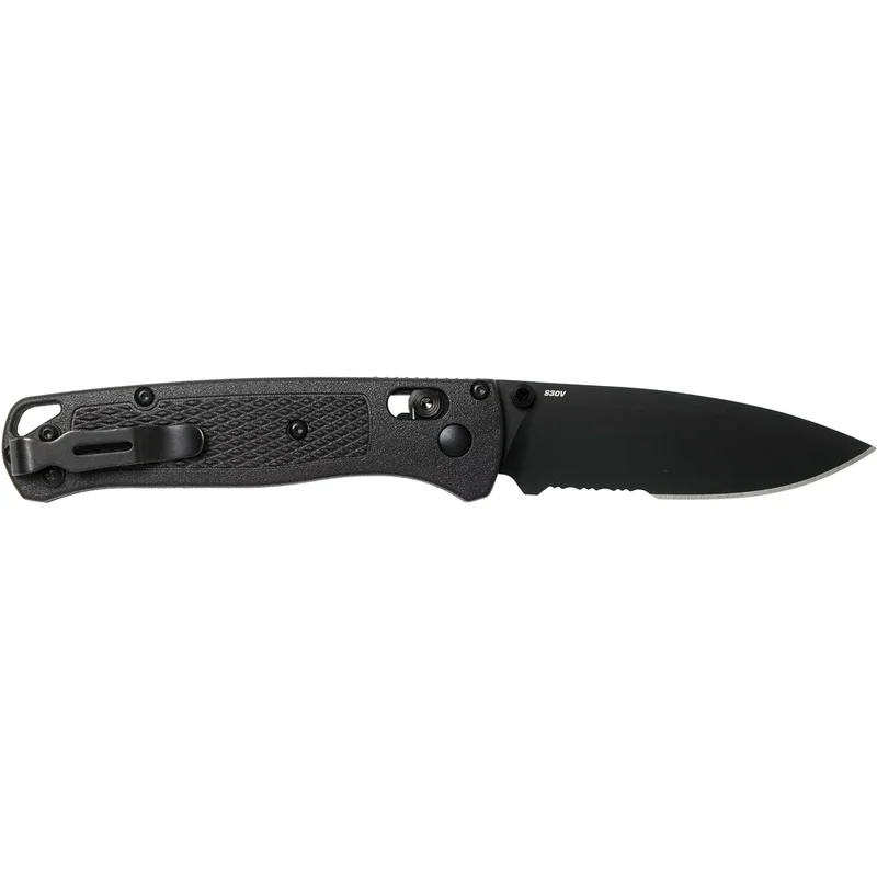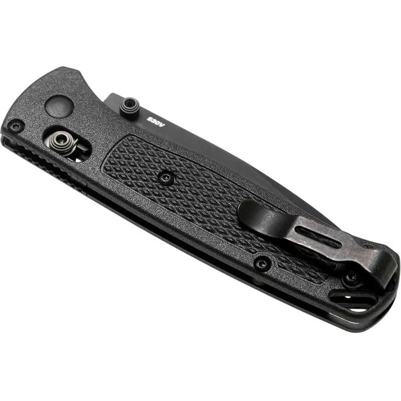Складаний ніж Benchmade Bugout - це надлегкий (вага 52 грами) і зручний ніж для альпіністів і завзятих мандрівників. Ергономічна конструкція розроблена з урахуванням вимог до ножа для повсякденного носіння. Невеликий клинок завдовжки 82 мм класичної форми Точка Падіння виготовляється з порошкової нержавіючої сталі CPM-S30V, яка, завдяки високому вмісту вуглецю (1,45%), хрому (14%), ванадію (4%) і молібдену (2%), відрізняється чудовим утриманням кромки, високою стійкістю до корозії і відмінним різом. Сталь СРМ S30V розроблена спеціально для задоволення потреби ножової індустрії в якісній сталі з дуже високими міцнісними властивостями. Розкриття ножа проводиться за допомогою двостороннього анодованого шпенька, а надійну фіксацію забезпечує розроблений і запатентований компанією Benchmade замок ВІСЬ. Рукоять виготовлена з легкого і міцного матеріалу CF-Elite™, і надійно прикручена чотирма болтами до лайнерів з нержавіючої сталі. Плашки текстуровані для кращого захоплення при роботі. Крім того, ніж буде зручний як правшам, так і лівшам, тому що виробник дає можливість переставляти кліпсу. Як доповнення в підставі рукояті розташоване досить великий отвір для темляка.