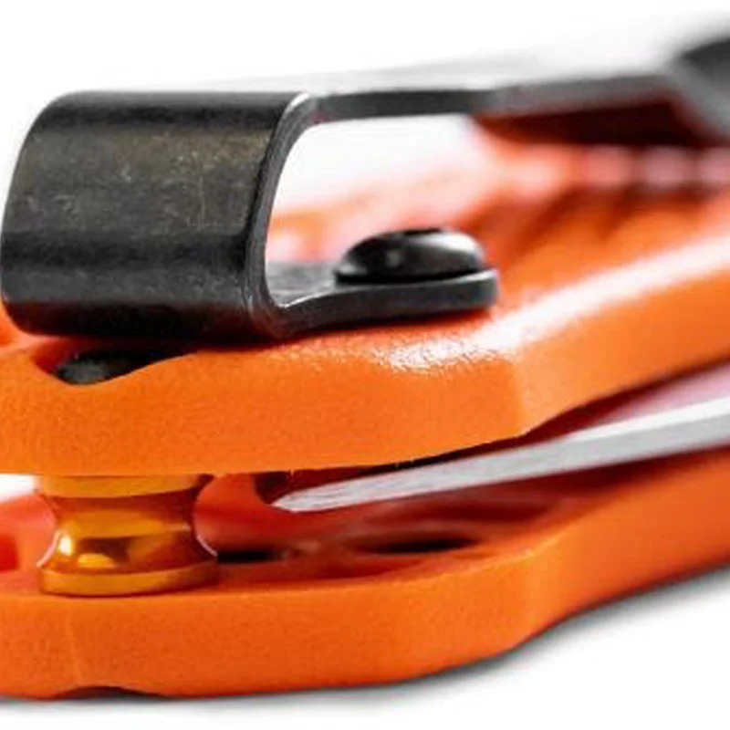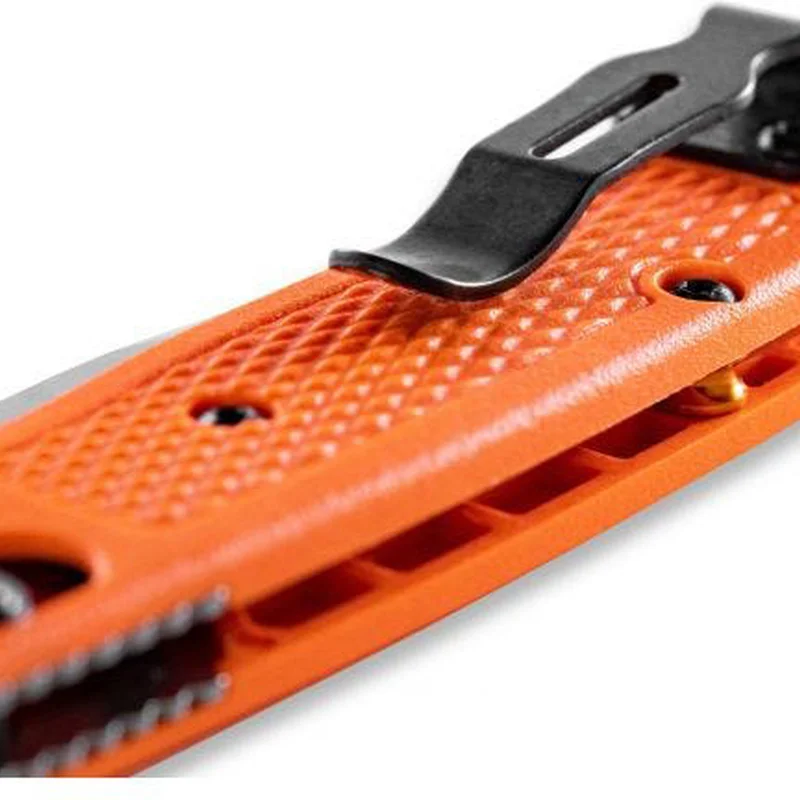 Рукоять виготовлена з одночасно яскравого і практичного синтетичного пластику Grivory яскраво-оранжевого кольору. Всередині вона приховує сталеві лайнери. Надійний замок Axis Lock працює чудово. Цей замок по праву вважається одним з найміцніших замків для складних ножів. Ніж зручний не тільки в утриманні, але і в носінні, завдяки наявності переставляється кліпси прихованого носіння.