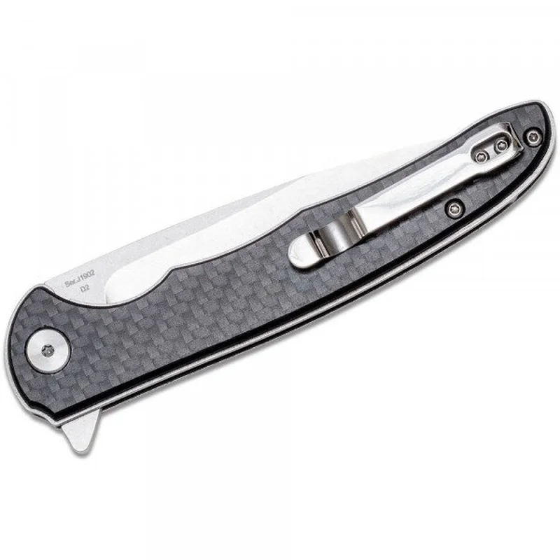 Лінії клинка плавно переходять в ергономічну ручку з накладками з вуглецевого волокна. Це дозволяє уникнути зісковзування ножа під час роботи навіть мокрими руками. Спеціальна подпальцевая виїмка забезпечує більш впевнений хват. Клинок приводиться в робоче положення за допомогою фліппера і фіксується замком Liner Lock.