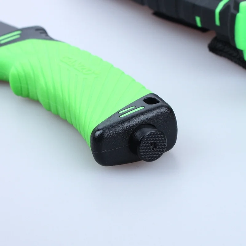 По відношенню до рукоятці лезо жорстко зафіксовано. Сама ж ручка зроблена з термопластику, відомого під назвою ABS. Цей матеріал одночасно легкий і міцний, зручний для використання при різній погоді протягом усього року. Щодо кольори рукоятки для Ganzo G8012, виробники пропонують два варіанти: чорний з оранжевим і зелений з чорним.