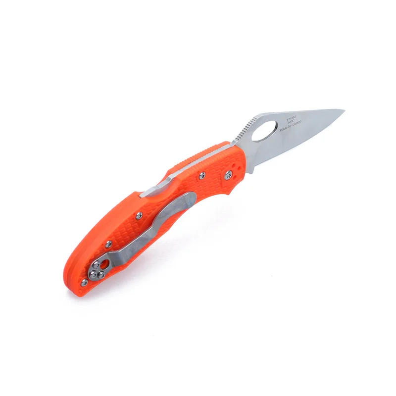 Що стосується рукоятки, то вона може бути оранжевою, чорної, рожевий або блакитний. Матеріалом для яскравих накладок послужив наповнений скловолокном нейлон. Це дуже міцний і стійкий до різного роду впливів матеріал, який прослужить багато років. Щоб ніж не прослизав у долоні, накладки зроблені текстурними. Щоб закріпити ніж у кишені і виключити його випадіння під час перенесення, рекомендується використовувати притискну кліпсу. Її можна встановити в тому положенні, яке здасться найбільш зручним (все можливе 4 варіанти).