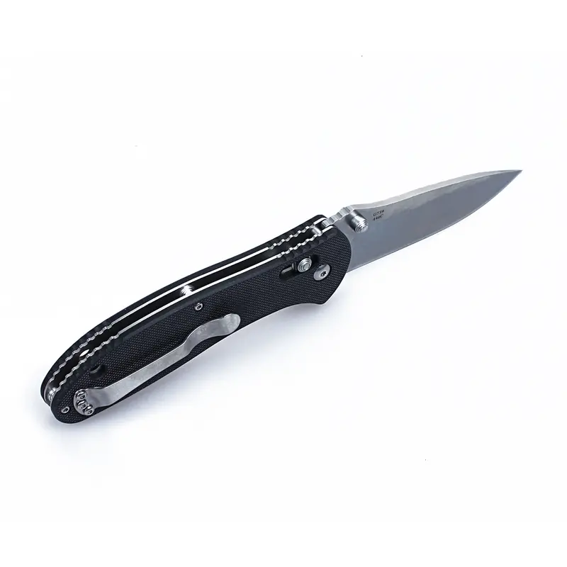 Клинок ножа Ganzo G7392 зроблений з якісної сталі, нержавіючої при контактах з водою. Це марка 440С, яку часто вибирають і інші великі виробники. Сталь такої марки гартується до 58HRC, що дозволяє ножу довгий час зберігати високу якість заточування. Клинок ножа міцний ще і за рахунок того, що його товщина дорівнює 0,33 див. Оброблений клинок особливим чином — відшліфований великими абразивами, які зробили поверхню леза майже матовою. Кромка леза — рівна. Це заточка класичного типу, що дозволяє зручно різати різні матеріали. Довжина клинка (без рукоятки ножа) становить 87 мм, чого достатньо і для господарських робіт у кемпінгу, і для приготування бутербродів.