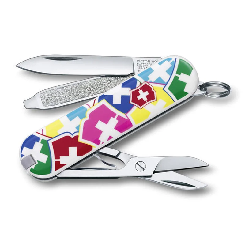 Білий хрест на тлі червоного щита – оригінальний логотип компанії Victorinox (Викторинокс) і державна символіка Швейцарії. Однак, в Victorinox Classic VX Colors 0.6223.841 хрест представлений на тлі різних кольорів, що і безумовно є головною особливістю цієї моделі. За рахунок яскравого, приємного на погляд дизайну Victorinox Classic VX Colors 0.6223.841 чудово підійде в якості подарунка для прекрасною так і для сильної половини людства. Складаний набір виготовлений з високоякісних матеріалів. Окремо з нержавіючої сталі з високоміцними пластиковими накладками. Тому, надійний і довговічний у використанні. Плюс, ручка не ковзає в руці і зручна у використанні. Оснащений швейцарський ніж відмінно різальним лезом. З його допомогою Ви з легкістю зможете виконати всі необхідні роботи. Приміром розкриєте конверт і навіть зможете нарізати продукти. Додатково модель оснащена відмінно ріжучими ножицями, а так само пінцетом і пилкою з очисником. Безумовно, що від цих інструментів буде в захваті кожна жінка. А от чоловіків більше порадує спеціальна викрутка. Адже, з її допомогою легко закрутити і відкрутити кріпильні вироби, наприклад шурупи або ж гвинти.