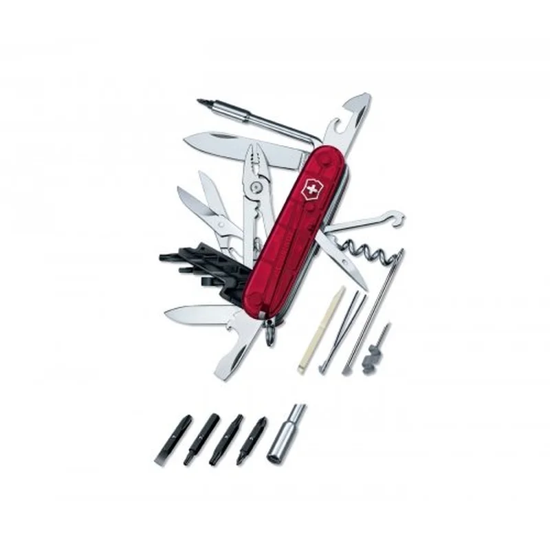 Victorinox Cybertool 1.7725.T – мультифункціональний, високоякісний, швейцарський універсальний ніж. Містить 25 різноманітних інструментів, виконуючих 35 функцій. «Swiss Champ. Cyber Tools» оснащений необхідними стандартними інструментами, які чудово підійдуть в щоденному використанні як для чоловіків, так і жінок. Безумовно, що в побуті кожного порадує відкривачка для пляшок, консервний ніж, штопор і інші інструменти. Додатково складаний ніж має тримач біт, шпильку і плоскогубці. Плюс, складаний ніж виготовлений виключно з високоякісних матеріалів. Головний з них – нержавіюча сталь. Окремо варто відзначити і красиву напівпрозору яскраво-червону ручку, яка не тільки радує кожен погляд, але і на відміну від інших моделей дозволяє легко вибрати потрібний інструмент.