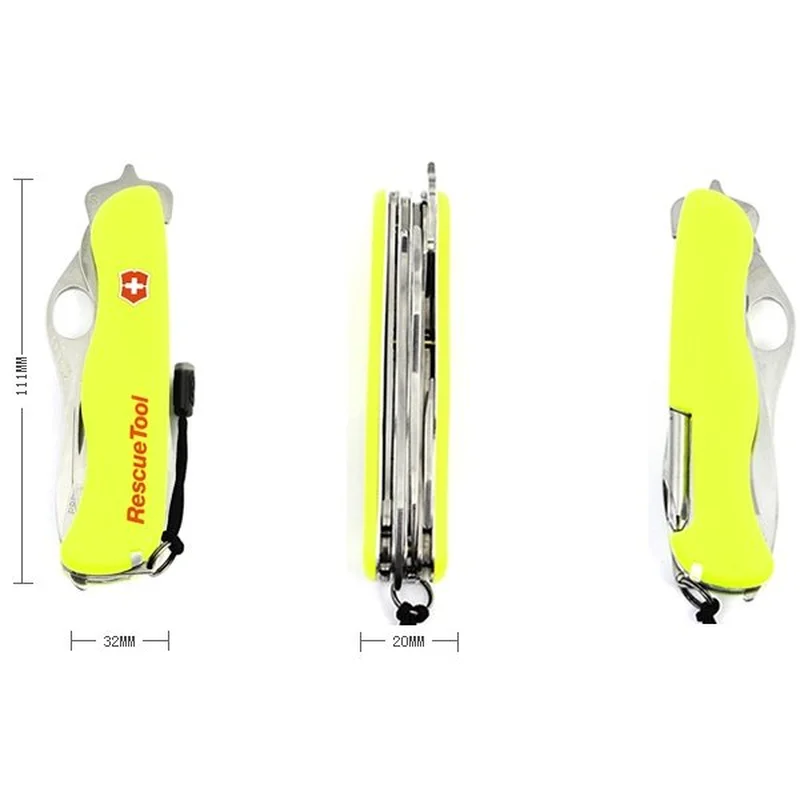 Швейцарський кишеньковий армійський ніж Victorinox Rescue Tool з фіксатором був розроблений спеціально для співробітників швидкої допомоги та МНС. Ключовим у ножі є блискавична здатність відкриватися і бути готовим до роботи. Лезо фіксується у відкритому положенні замком типу лайнер-лок, а накладки на рукояті виключають ковзання в руці. Крім того, ніж Victorinox дуже практичний і містить всі основні інструменти для повсякденного життя. Ніж виготовлений з високоякісної нержавіючої сталі. Рукоять виконана з жовтого матового нейлону. Розмір – 113x31.5x18 мм. Вага – 240 г..