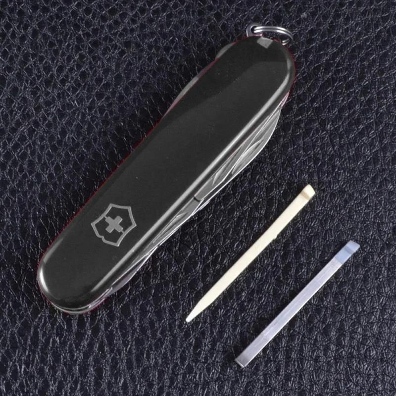 Всі ножі Victorinox 91 мм із пластиковими накладками мають спеціальний отвір під шпильку в накладці біля штопору (у комплектацію до цієї моделі шпилька не входить і продається окремо).