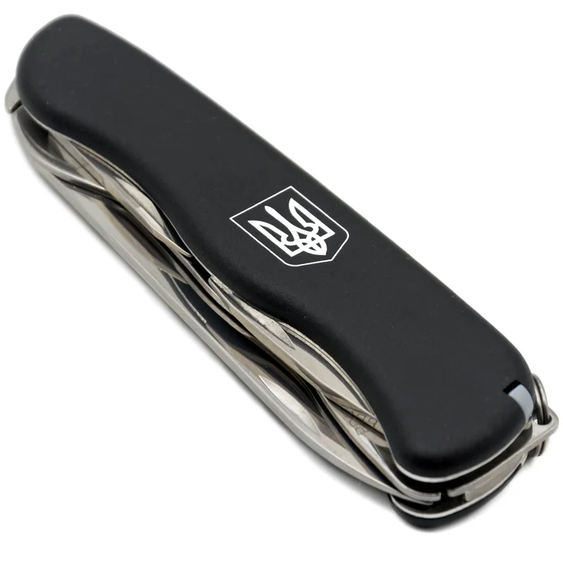 Для оформлення рукояті було обрано насичене чорне тло, прикрасою якого послужили, нанесені методом високоякісного друку герб України та фірмова символіка Вікторінокс. Товстий шар лаку, що зміцнює, підкреслює глибину і насиченість кольорів, а також надійно захищає оформлення від зносу і втрати первісної цілісності.