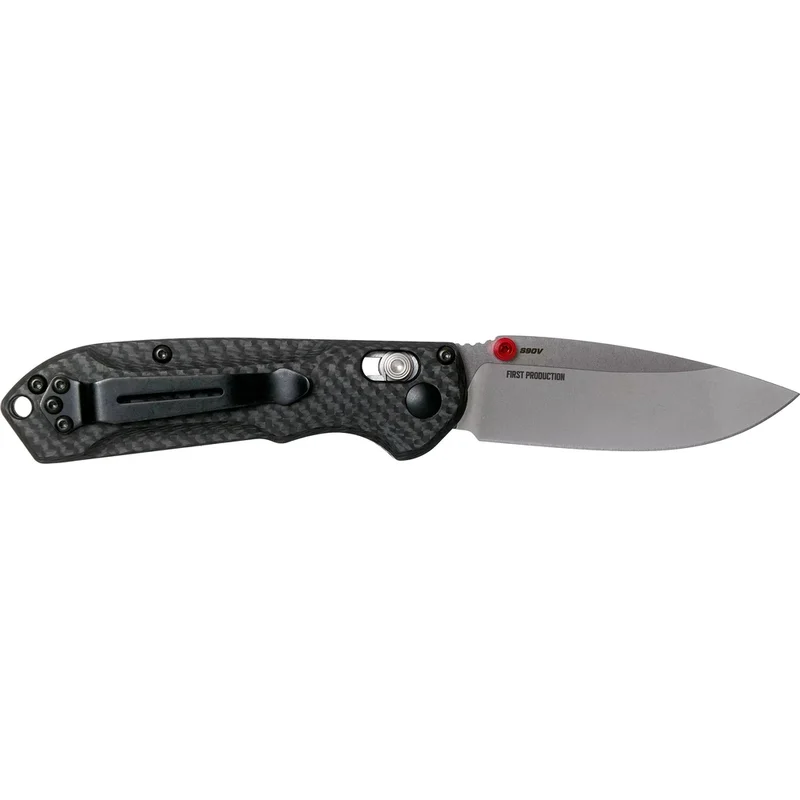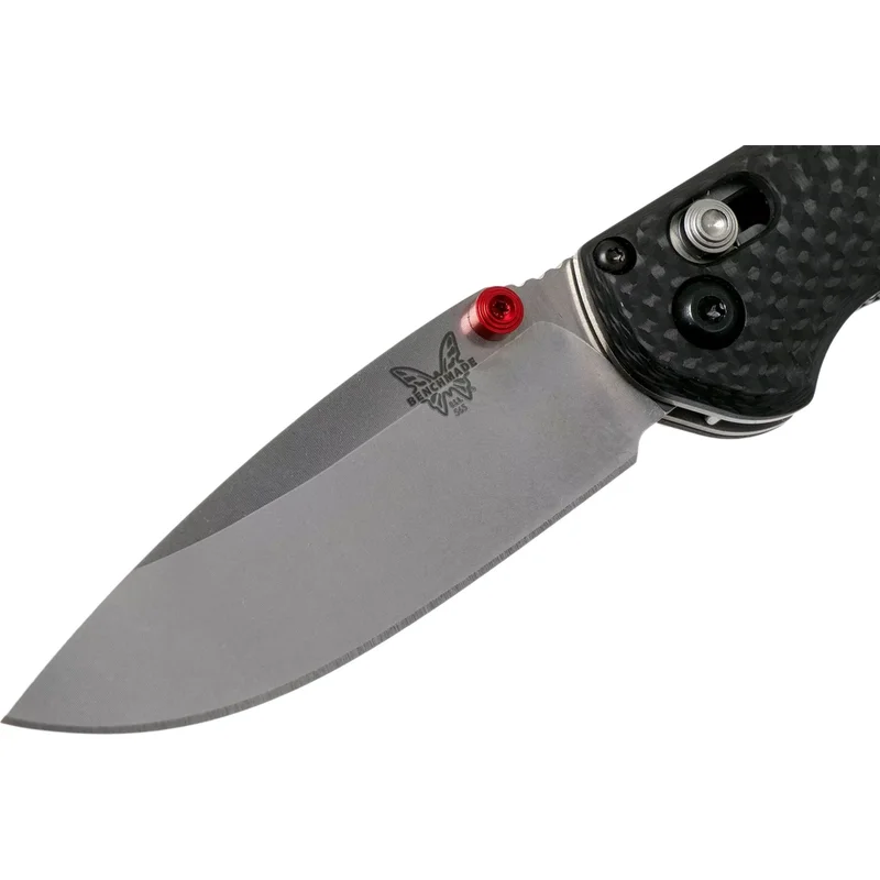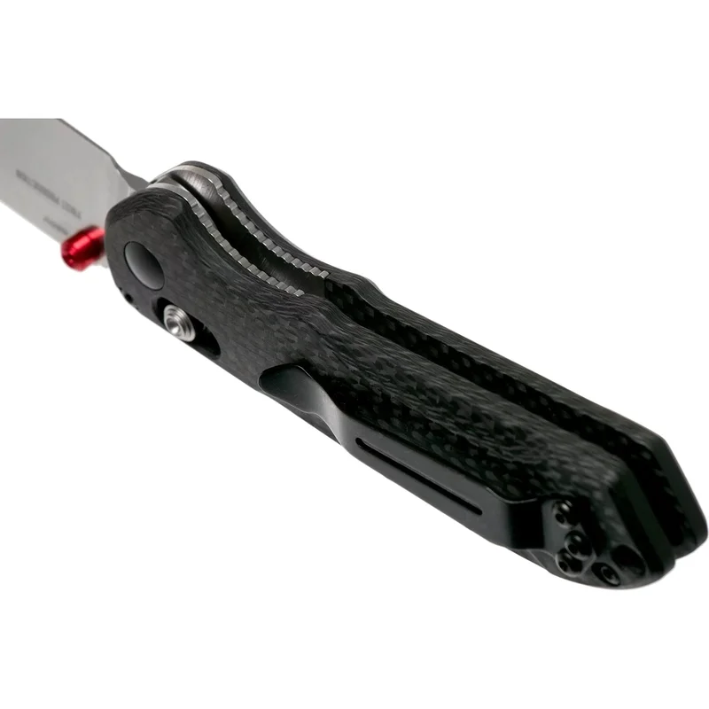 Рукоятка ножа Бенчмейд Mini Freek виготовлена з ультрасучасного вуглецевого волокна, яке доповнене яскравими червоними акцентними бонками.