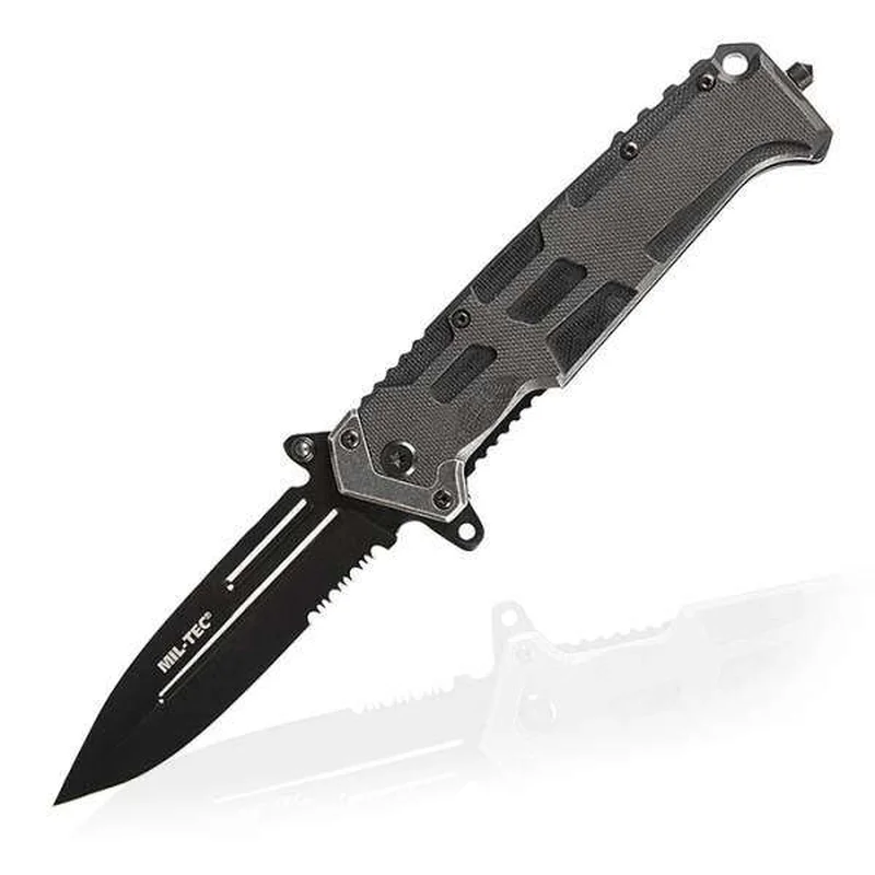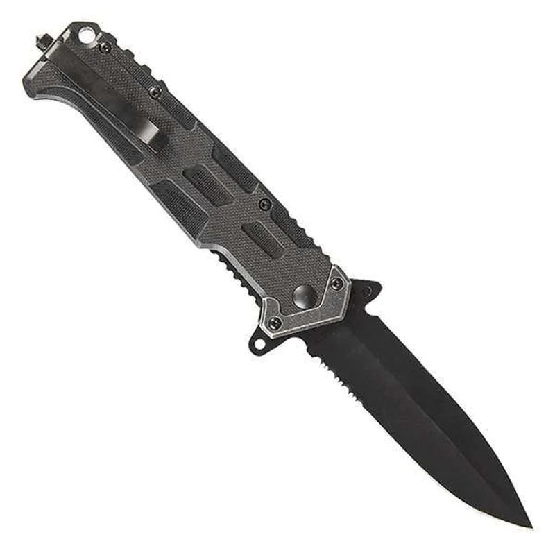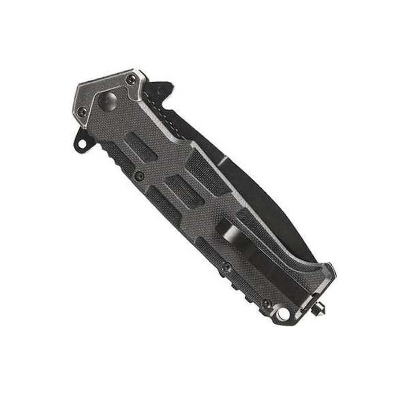 Складной нож Assault Knife от Mil-Tec™,- это однорукий, перочинный нож со стеклобоем и клипсой, который вы сможете цеплять на пояс или свое военное/туристическое снаряжение. Карманный нож оснащен надежным фиксатором, который предотвратит случайное складывание, и шероховатой рукоятью с упором большого пальца, благодаря чему нож хорошо ложится в руку и обеспечивает надежный хват. Характеристики: Материал: сталь 440 Материал рукоятки: G10 Дополнительно: отверстие для темляка Особенность: стеклобой Толщина клинка: 3 мм Общая длина: 22 см Длина клинка: 9 см Длина ручки: 13 см Фиксация: клипса Цвет: черный Замок: Liner Вес: 160 г