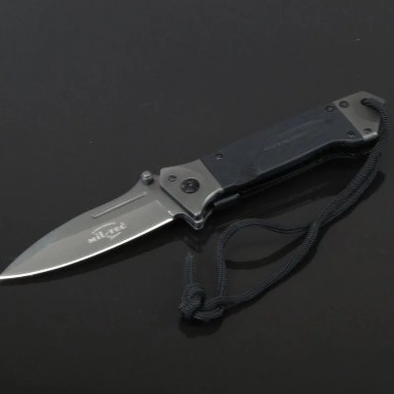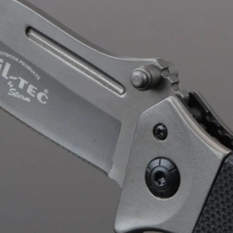 Туристический складной нож довольно крупного размера от немецкой компании Mil-Tec. Благодаря форме клинка нож идеально подходит для реза, колки и рубки. Такой тип заточки довольно популярный благодаря двум режущим поверхностям основного лезвия и кончика, что существенно расширяет диапазон применений. Рукоять стальная с накладками из полимера G10. Оборудована клипсой для крепления ножа в кармане, на поясе или на снаряжении. Имеет отверстие под темляк. Как и большинство современных складных ножей, данная модель оборудована фиксатором лезвия по типу Liner Lock.