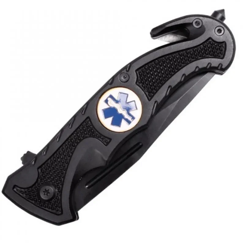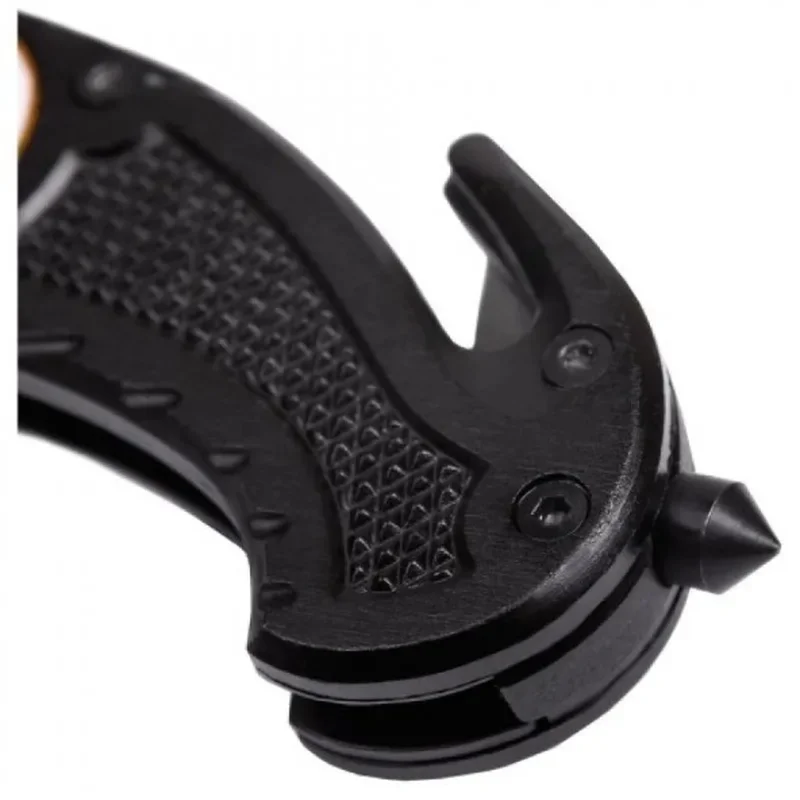 На конце ручки есть разбойник и острый нож для быстрого разрезания ремней безопасности, тросов или веревок.