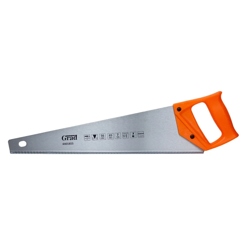 Ножівка по дереву 450мм 7TPI GRAD (4401855) призначена для поздовжнього і поперечного розпилу заготовок середніх і дрібних розмірів деревини з м’яких і твердих порід, ДСП, фанери і ПВХ.