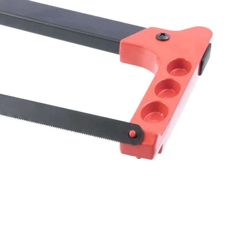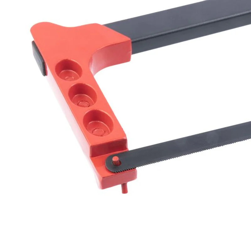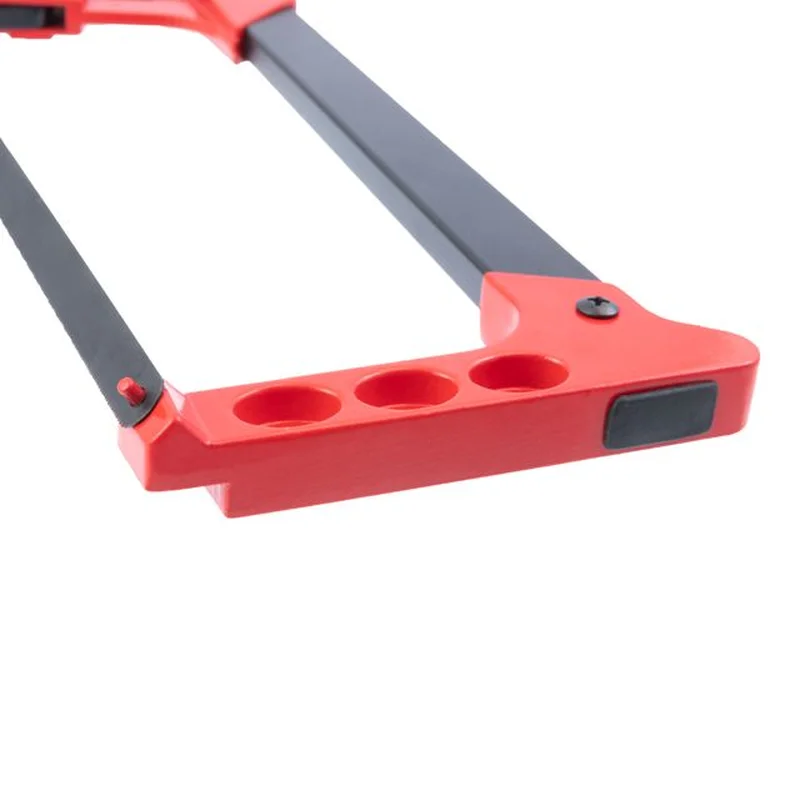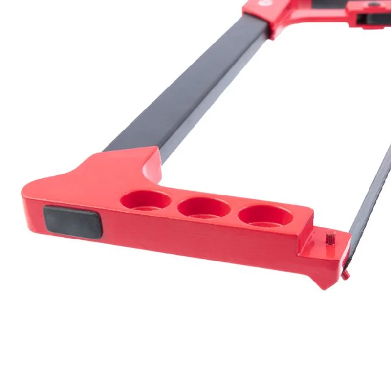 Ножівка з алюмінієвою рамкою досить легка та не обтяжує руки. Зручна ручка з гумовою накладкою підвищує комфорт у роботі та забезпечує надійне зчеплення з долонею. На верхній частині передбачений упор для другої руки для кращого контролю над інструментом.