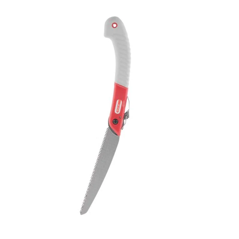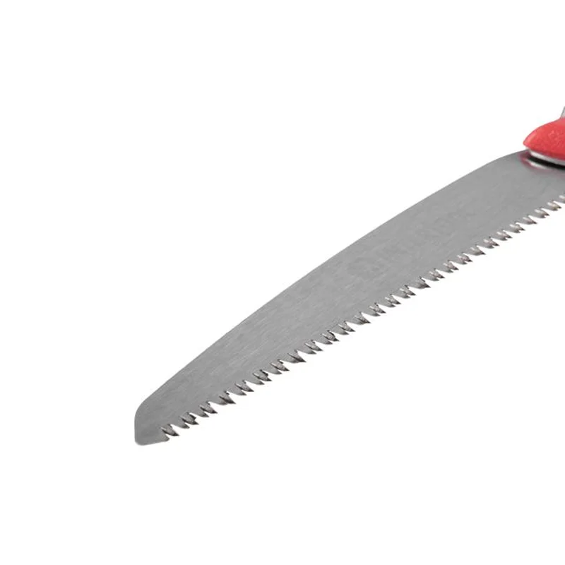 Пила садова не деформується, а заточка довго залишається гострою, полотно виготовлено зі зносостійкої інструментальної сталі. Ручка легка, виготовлена з пластику, зручна з протиковзними насічками. Завдяки складаній конструкції з фіксатором, пилку можна компактно скласти та безпечно носити з собою в рюкзаку, сумці з іншими інструментами та ін.