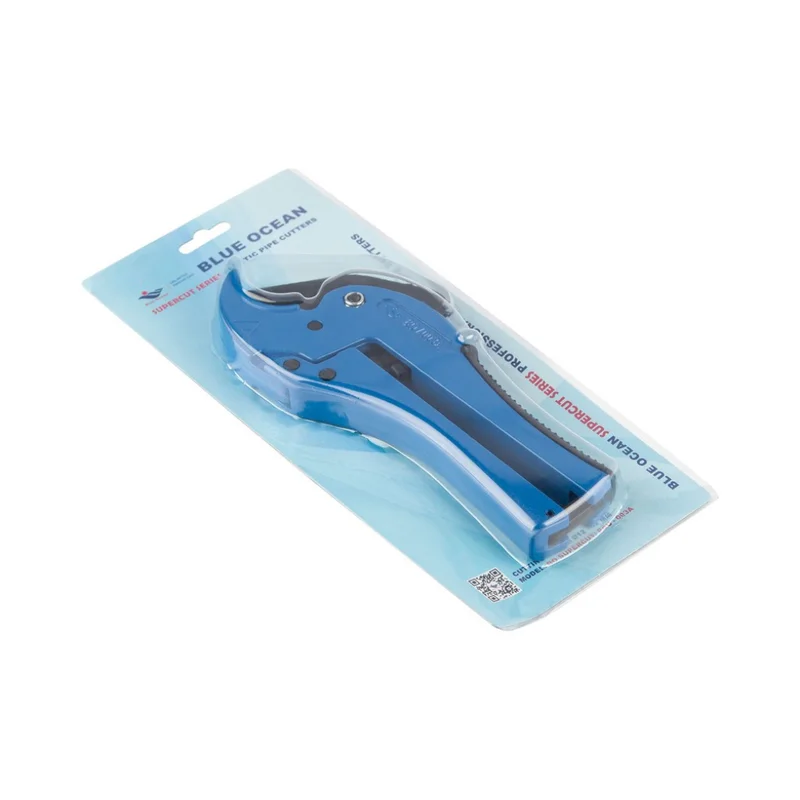 Ножиці для обрізання металопластикових труб Blue Ocean 16-40 виконані з нержавіючої сталі у синьому кольорі з фіксатором, завдяки якому інструмент можна безпечно зберігати та переносити. Дані ножиці підходять для роботи з пластиковими або металопластиковими водопровідними трубами та трубами для встановлення теплої підлоги діаметром до 40 мм. Вони мають невелику вагу, тому під час роботи кисть не втомиться, гостре лезо із загартованої сталі та зубчастий механізм забезпечать рівний зріз. Тип конст