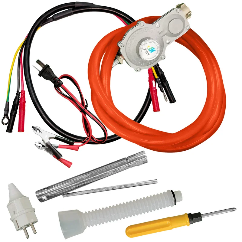 Генератор укомплектований додатковими аксесуарами: ключ свічковий, лійка для зручного заливання моторної оливи, шнур для паралельного підключення, шланг з редуктором, вилка 16 А Schuko, викрутка РН2 6,0 мм, клеми для заряджання акумулятора.