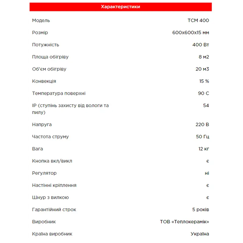• Долговечность. Конструкция Teploceramic TCM 400 монолитная - нагревательный элемент не контактирует с воздухом, увеличивает его срок службы.