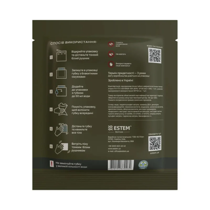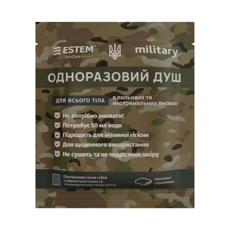 Estem Military - Одноразовый сухой душ для военных стандартов гигиены. Продукт Estem Military является инновационным решением в сфере личной гигиены, специально адаптированным для военнослужащих, пациентов в стационарах, пожилых людей и путешественников. Комплектация включает мыльную губку и полотенце, обеспечивая все необходимое для быстрого и эффективного очищения в любых условиях.