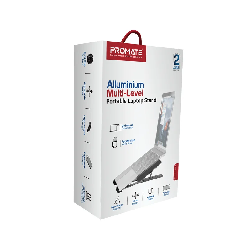 Портативна підставка-трансформер Promate PocketMount - ідеальний ґаджет для організації комфортного робочого місця, який завжди можна взяти із собою. Особливості: 6 варіантів нахилу: Розташуй ноутбук або планшет під зручним для себе кутом в діапазоні від 25 до 35 градусів. Функціональна конструкція: Антиковзкі накладки в парі з прогумованими упорами захищають від подряпин і надійно фіксують ноутбук або планшет. Компактний розмір: PocketMount не займає багато місця і з легкістю поміститься до сумки. Габарити в складеному стані 65х20х156 мм. Пасивне охолодження: Покращує теплове розсіювання та забір повітря за рахунок спеціальної каркасної конструкції та положення ноутбука над поверхнею. Якісні матеріали: Виріб з авіаційного алюмінієвого сплаву відрізняється великим запасом міцності та малою вагою. Мінімалістичний дизайн: Стильна підставка лаконічно впишеться в будь-який інтер’єр та стане ідеальним аксесуаром до твого девайсу. Широка сумісність: Підходить для будь-яких пристроїв із діагоналлю до 14 дюймів.