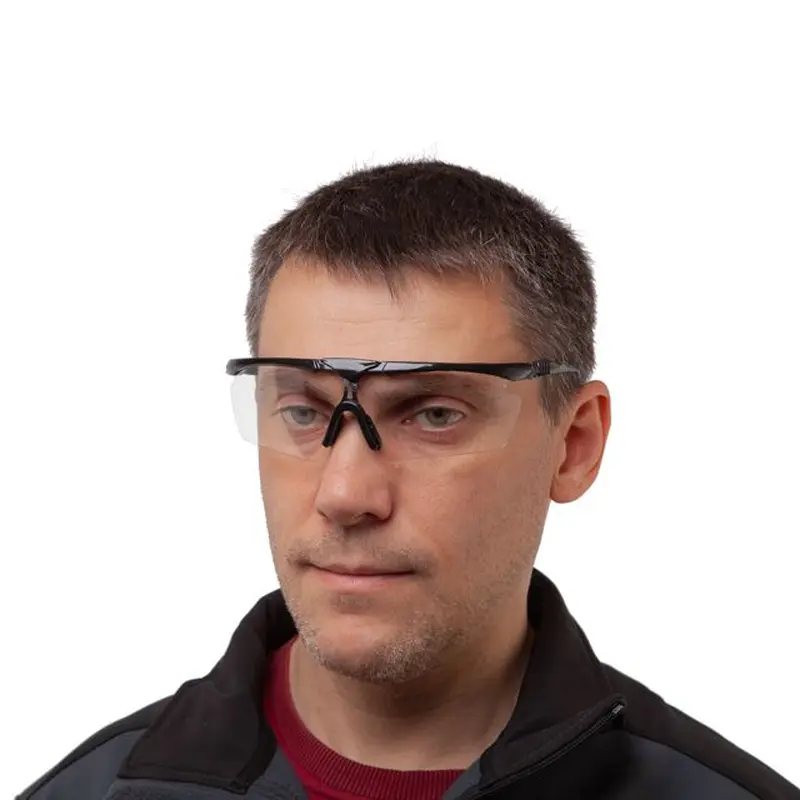 Окуляри забезпечують чітку видимість. Прозорі лінзи з полікарбонату мають широкий панорамний огляд. Ергономічна чорна оправа не викликає дискомфорту, завдяки носоупорам та округлій формі гарантує зручну посадку окулярів на обличчі.