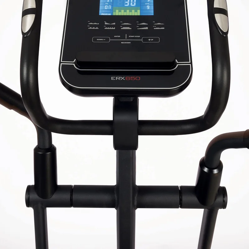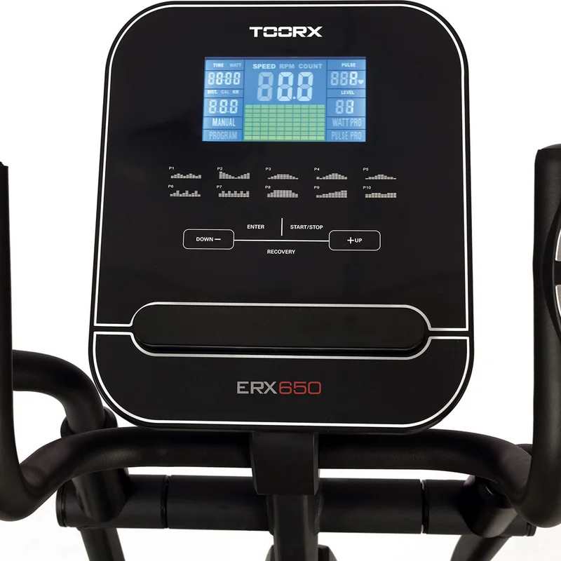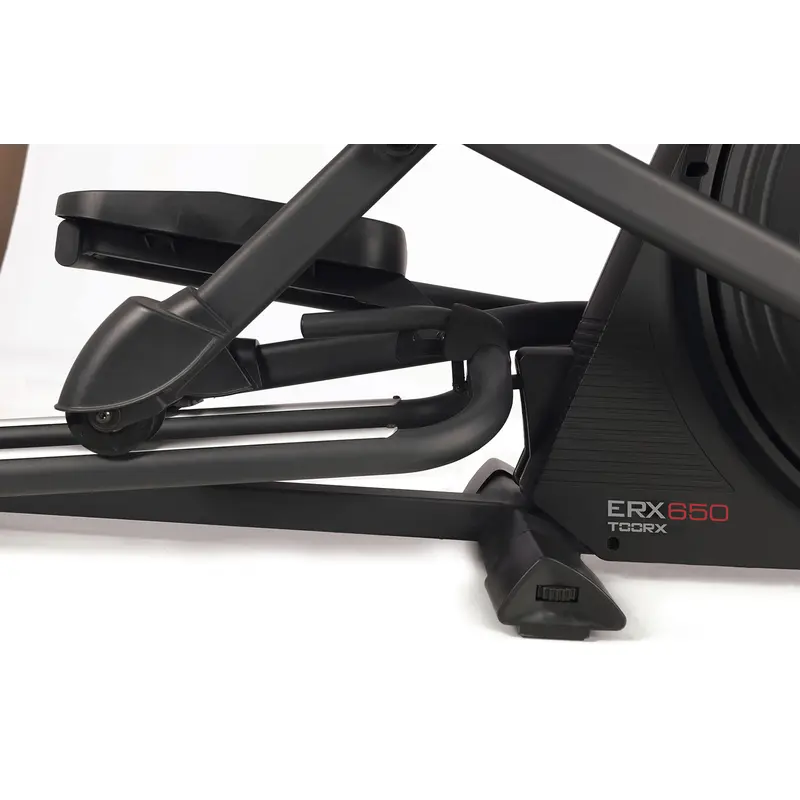 Орбітрек Toorx Elliptical ERX 650 (ERX-650) із преміальної лінійки Chrono Line італійського виробника Garlando S.p.A. призначений для інтенсивного кардіотренування в домашніх умовах. Тренажер має 24 рівні навантаження, що регулюються за допомогою сучасного комп'ютера. 16-кілограмовий маховик створює чудову плавність ходу, знижуючи навантаження на суглоби та мінімізуючи ризик отримання травми в процесі занять. Орбітрек розрахований на вагу до 130 кг, а довжина кроку 51 см припаде до вподоби навіть найвибагливішим користувачам. Вбудований приймач для бездротового датчика вимірювання пульсу буде доречним під час тренування по одній із чотирьох пульсозалежних програм. Консоль тренажера має підставку для смартфона/планшета та підтримує Bluetooth для інтеграції з популярними додатками Kinomap і Zwift, які перетворять монотонне тренування в захоплюючий процес.