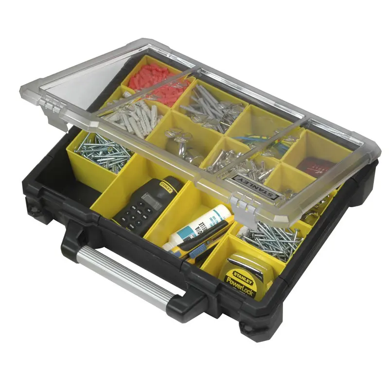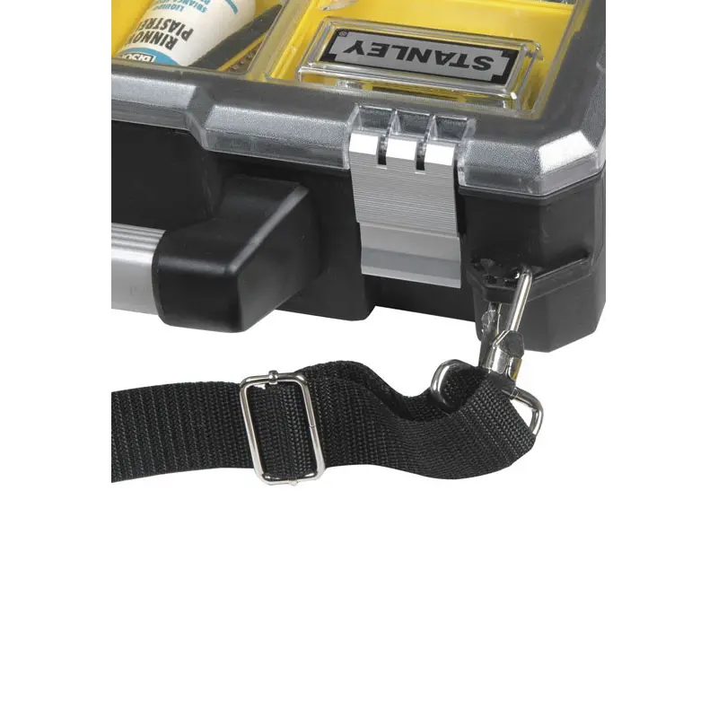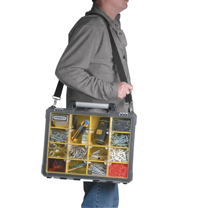 Органайзер для інструменту профі (14 елементів) 49х43х11см STANLEY 1-93-293 Органайзер професійний "XL" пластмасовий з алюмінієвою ручкою.Збільшений об'єм - для максимальної ефективності системи зберігання.Для найкращих експлуатаційних характеристик конструкція поєднує метал і високоміцну пластмасу: міцна прозора кришка з полікарбонату, металеві частини в найбільш відповідальних місцях: ручки, петлі, замкиШирока алюмінієва ручка для стабільності при перенесенні і зручності при великому навантаженні, дозволяє братися за неї рукою в рукавичціМіцні захищені від іржі замки і петліНаплічний ремінь для зручного носіння14 глибоких знімних відділень двох розмірів; кришка має спеціальну конструкцію, яка утримує відділення для зберігання на місці