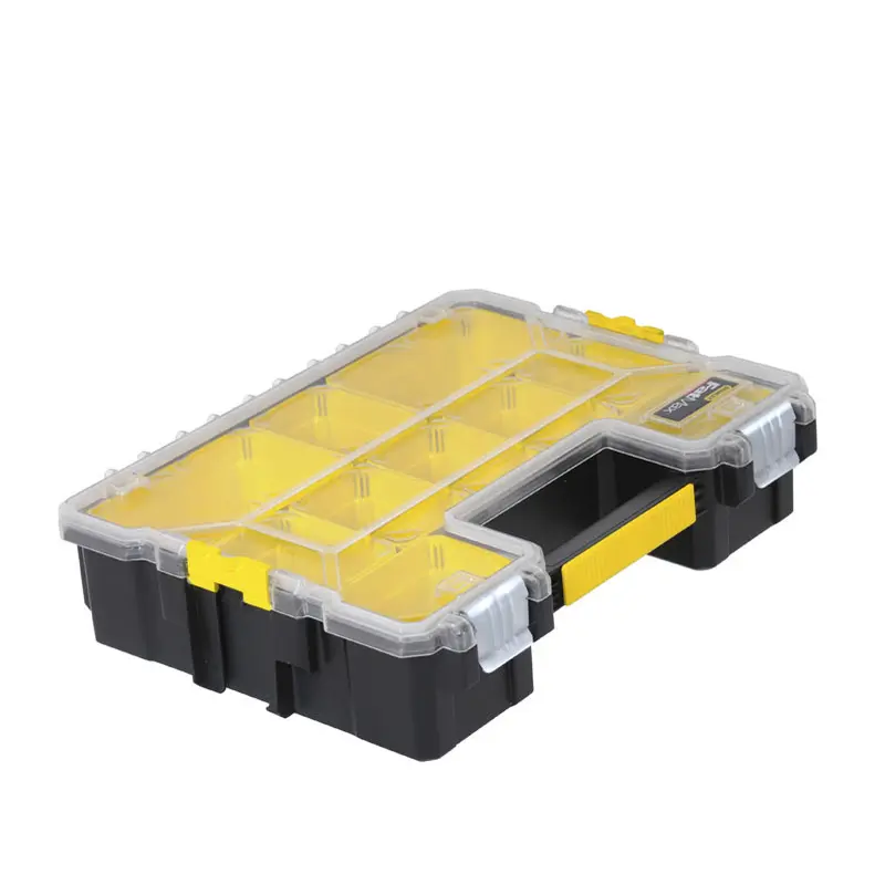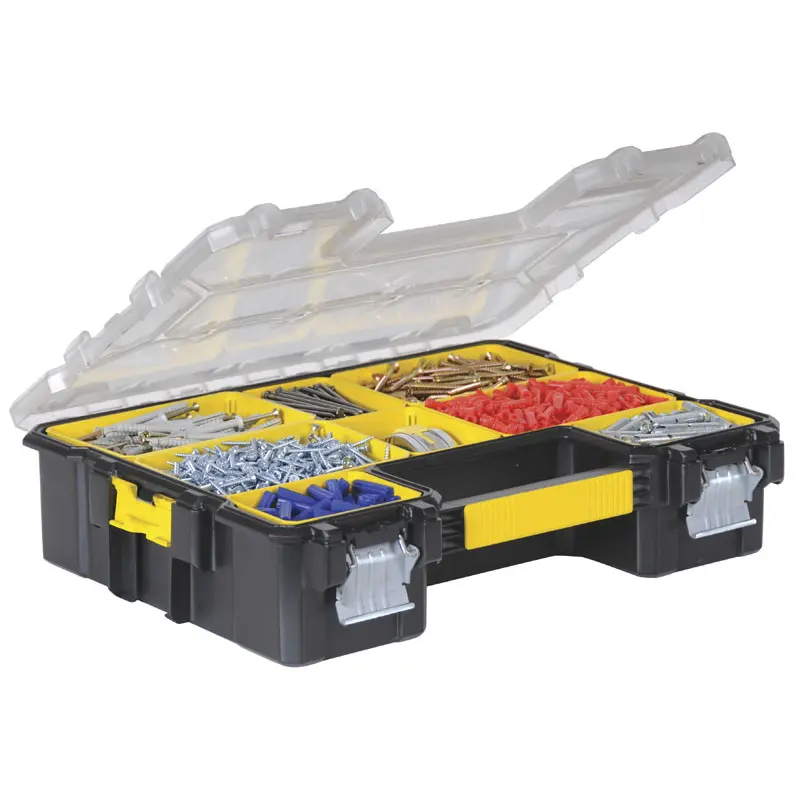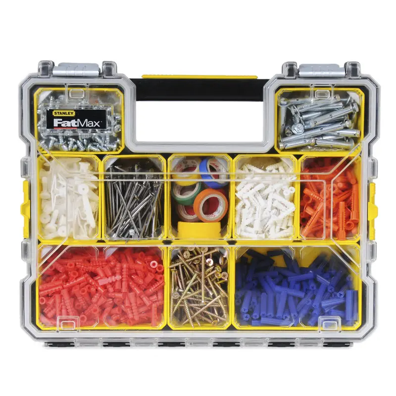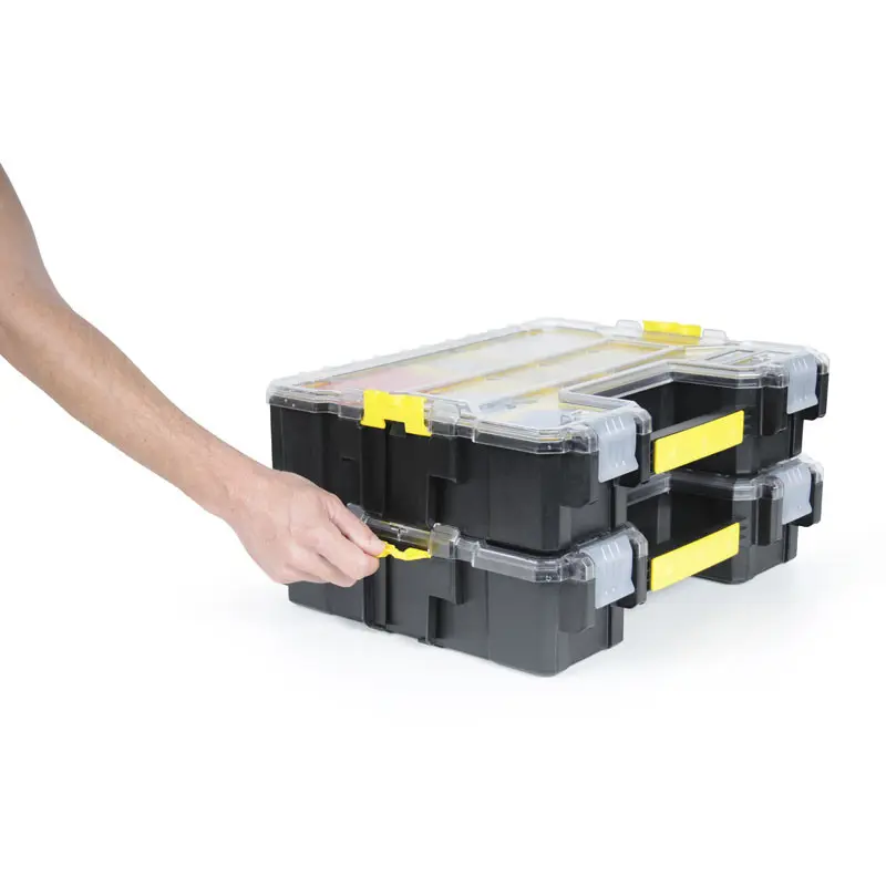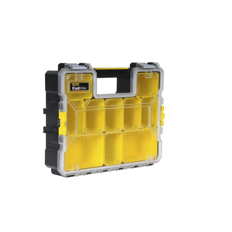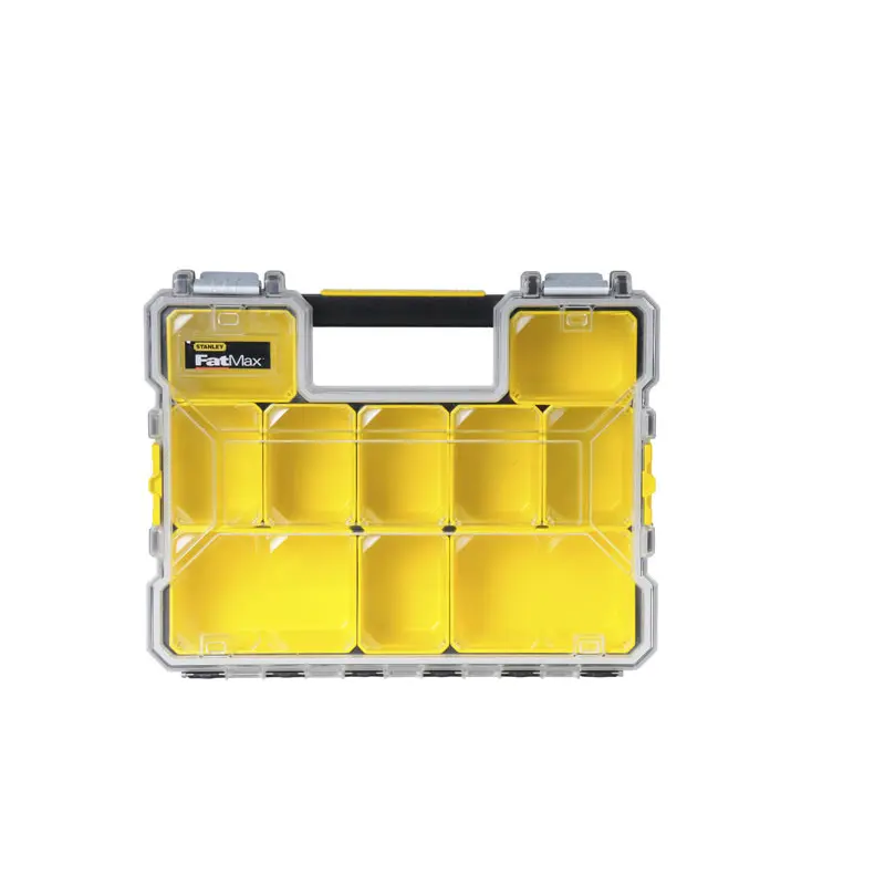 Інструментальний Ящик-органайзер пластмасовий вологозахисний з метал. замками (44,6 x x 11,6 35,7) FatMax Shallow Pro Metal Latch STANLEY 1-97-518 Органайзер професійний "FatMax Deep Pro Metal Latch" пластмасовий вологозахисний з металевими замками.Знімні відділення для дрібних деталей та аксесуарівУдаростійка прозора кришка з полікарбонату має унікальну конструкцію, утримуючу відділення для зберігання на місціВисокоміцні ручка і замкиНе виступає за габарити органайзера широка ручка для зручності перенесення і зберіганняМіцні металеві петліЗамки з боків для надійного скріплення декількох органайзерів при розміщенні їх один на одногоВодозахисне ущільнення по периметру органайзера
