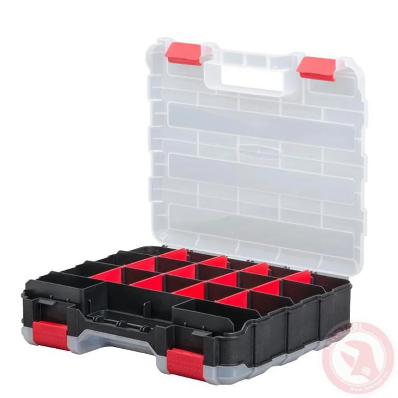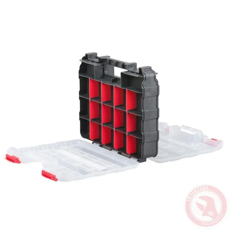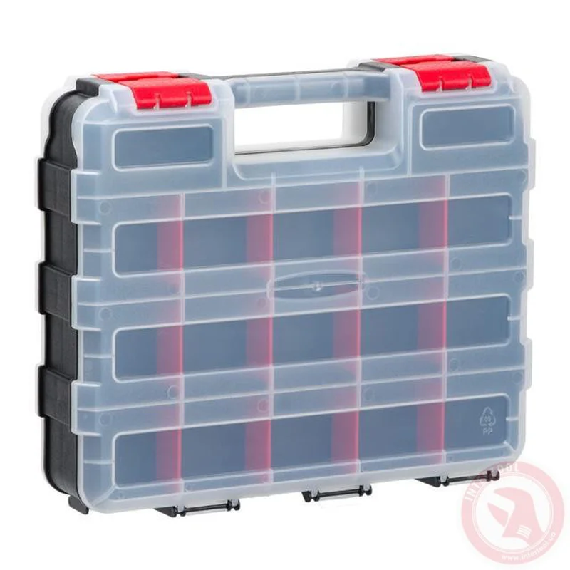 Зручний та місткий двосторонній органайзер (320х270х80 см) підходить для зберігання та транспортування невеликих предметів (дрібних кріплень, інструментів, фурнітури, запчастин, рибальського приладдя та ін.). Особливості Комірки розміщені по обидві сторони ящика: Ви можете зберігати в два рази більше дрібниць. Ребра жорсткості по всій поверхні органайзера роблять його міцним та надійним. Нічого не випадає та не змішується під час носіння, завдяки містким коміркам та надійним замкам. Знімні стінки дозволяють змоделювати розмір та кількість секцій. Органайзер прослужить Вам тривалий час, оскільки виготовлений з міцного, товстого пластику з посиленими ребрами жорсткості. У Вашому розпорядженні 34 секції: по 17 з кожної сторони. Стінки секцій знімаються і моделюється необхідний розмір комірки. Завдяки чому, Ви можете покласти інструменти, довжиною до 30 см! Кришка виготовлена з поліпропілену та посилена ребрами жорсткості. Стійка до сколів, що дозволяє зберігати органайзери один на одному. Прозорі кришки дозволять швидко знайти необхідну річ. Інструмент не розсипається, завдяки надійним замкам. Ручка посилена і повторює форму руки, що дуже зручно при транспортуванні. Візьміть органайзер у руки і Ви відчуєте, наскільки він надійно зроблений. З цим органайзером все необхідне завжди у Вас під рукою та на своїх місцях. Ящики для інструментів, органайзери, системи зберігання №1 в Україні. За результатами незалежного рейтингового дослідження у рамках проекту Українська Народна Премія 2021 року.