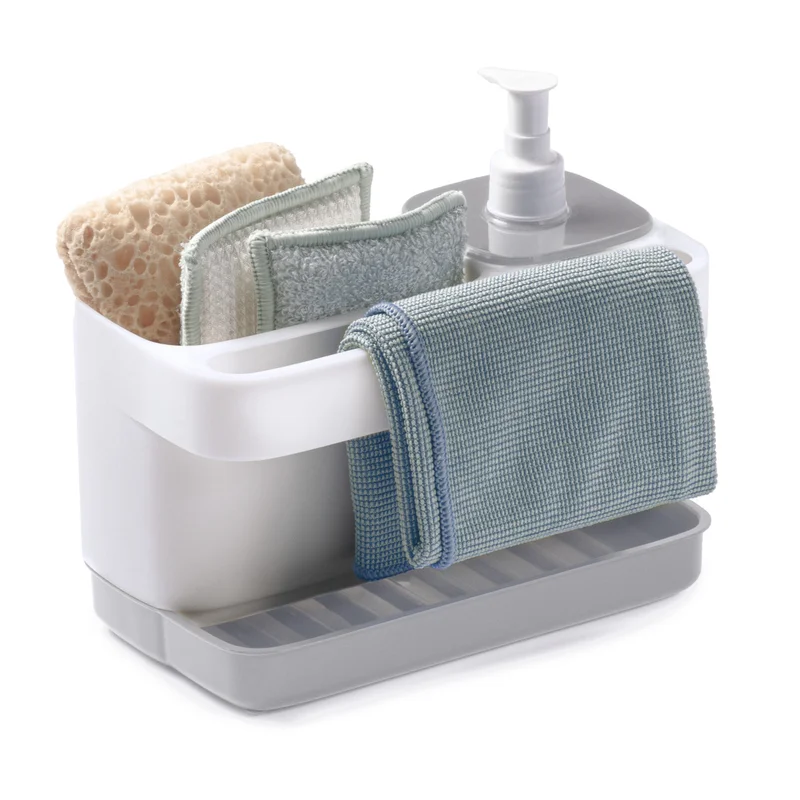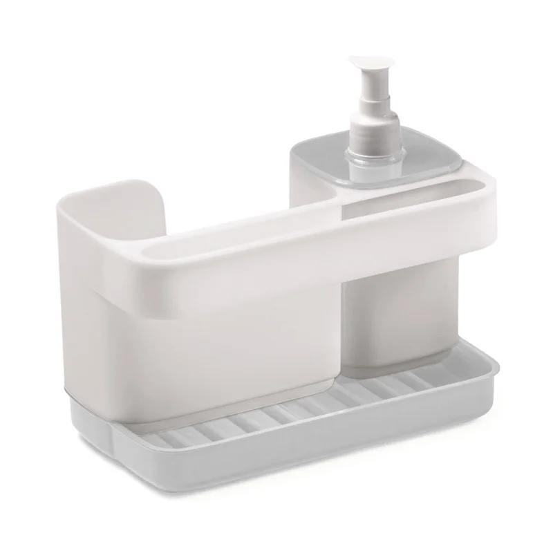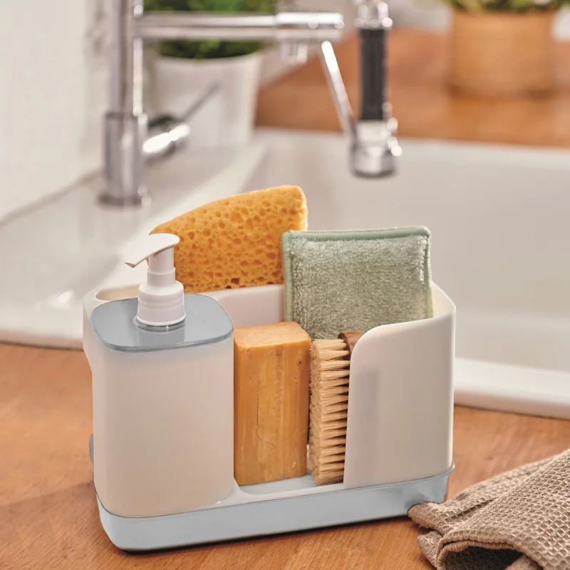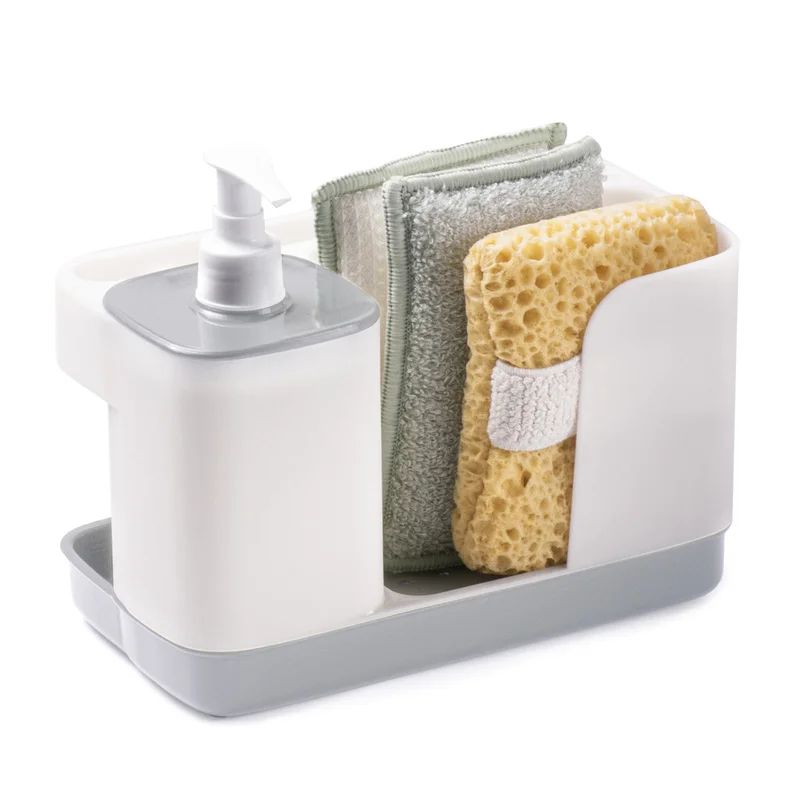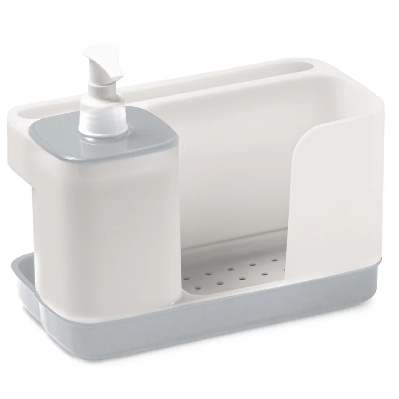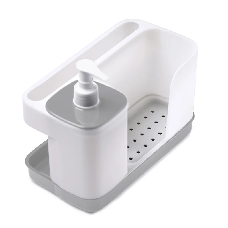 Ергономічність та широкий функціонал органайзера полягає у поєднанні в одному виробі: дозатора для рідкого мила або засобу для миття посуду (400 мл), відділення для губок і рукавичок, а також тримача для ганчірок. За бажанням виріб також можна використовувати для зберігання зубної пасти, зубних щіток і засобів для чищення у ванній кімнаті. Знизу укомплектований підставкою, в яку через отвори стікатиме волога з приладдя, залишивши поверхню навколо охайною й чистою та попередивши утворення цвілі чи неприємних запахів. Також виріб підходить для миття та дезінфекції у посудомийній машині.