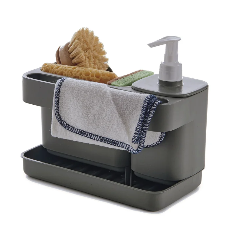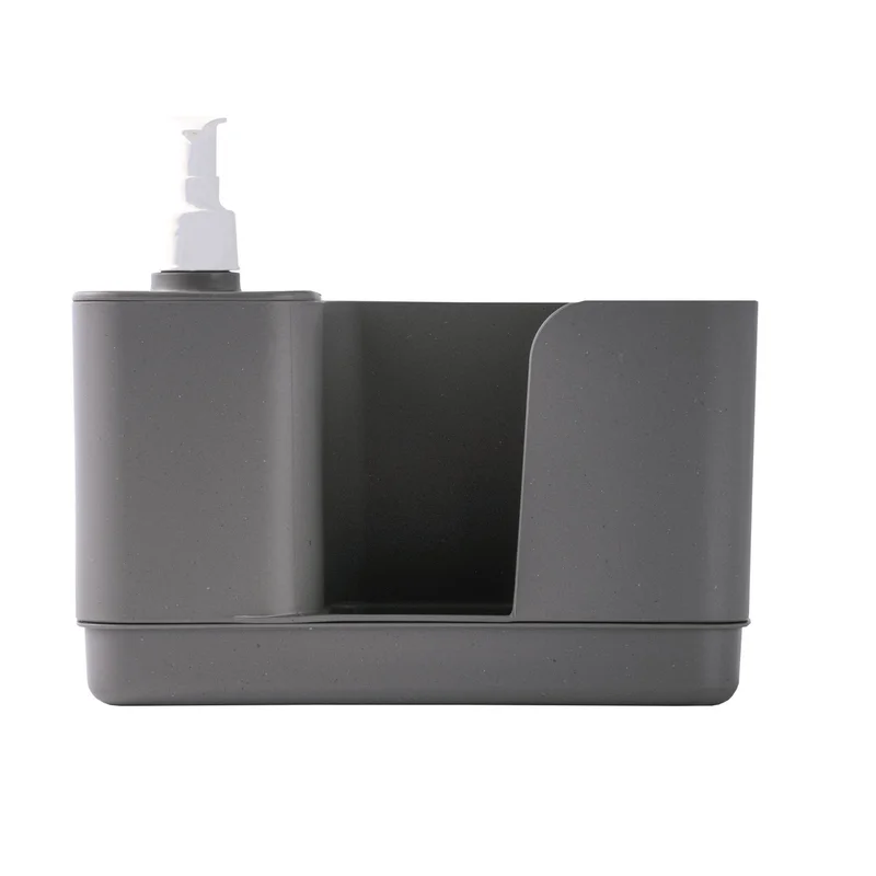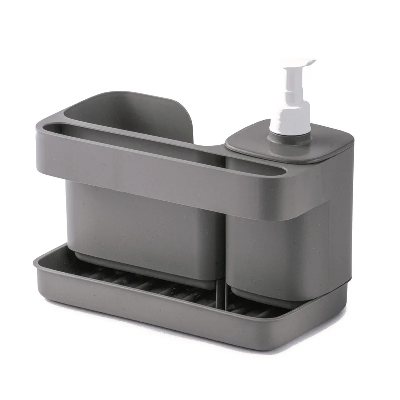 Ергономічність та широкий функціонал органайзера полягає у поєднанні в одному виробі: дозатора для рідкого мила або засобу для миття посуду (400 мл), відділення для губок і рукавичок, а також тримача для ганчірок. За бажанням виріб також можна використовувати для зберігання зубної пасти, зубних щіток і засобів для чищення у ванній кімнаті. Знизу укомплектований підставкою, в яку через отвори стікатиме волога з приладдя, залишивши поверхню навколо охайною й чистою та попередивши утворення цвілі чи неприємних запахів. Також виріб підходить для миття та дезінфекції у посудомийній машині.