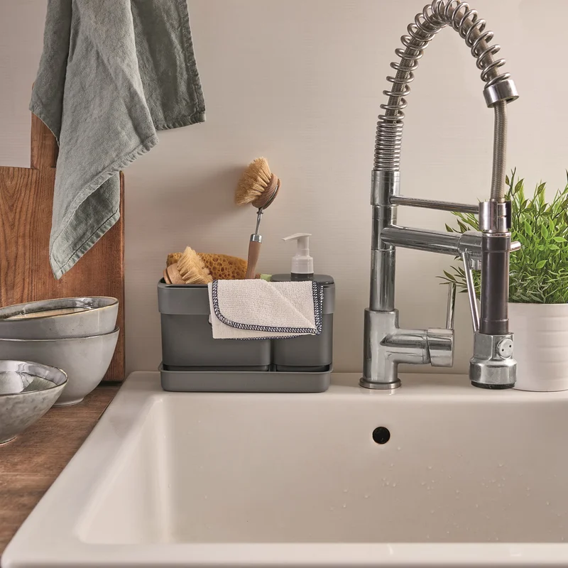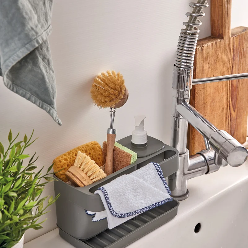Органайзер кухонний з дозатором для миючого засобу Snips у практичному сірому дизайні — це багатофункціональний виріб для підтримання охайності простору, який ідеально підходить, щоб завжди тримати приладдя для миття посуду та раковини впорядковано під рукою.