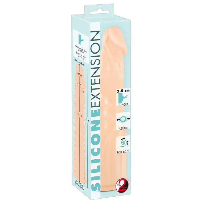 Ніжний силікон, з якого виготовлена насадка, що не натирає шкіру при належному зволоженні й не подразнює її. Реалістична текстура створює ілюзію проникнення справжнього члена, що напевно оцінить Ваша партнерка. Насадка має яскраво виражену голівку і невеликий рельєф, що імітує природні складки шкіри та опуклі вени. Вона надягається на член як латексний виріб і не має додаткових кріплень. Матеріал Silicone Extension досить еластичний, тому Ви можете не переживати, що насадка надто туго стисне Ваш пеніс.