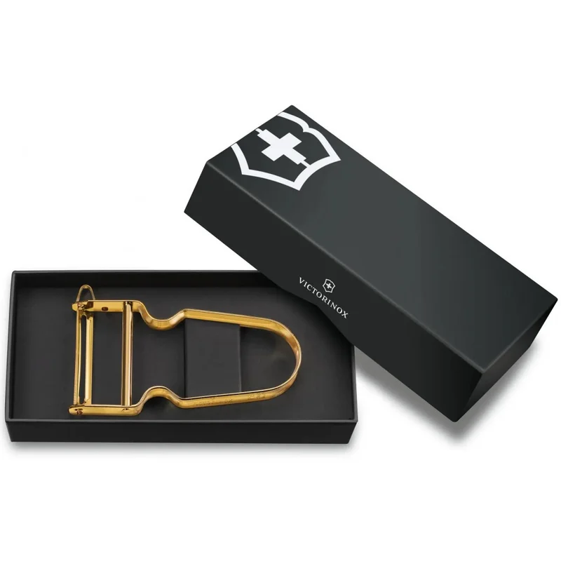 Лімітована овочечистка REX Golden від Victorinox (24-каратне золоте покриття) - це ефектний та ефективний кухонний інструмент, який дозволяє легко чистити всі види фруктів та овочів. Він також підходить для різання шоколаду та сиру.