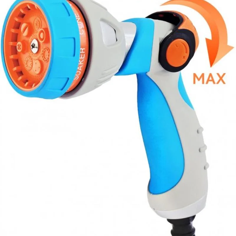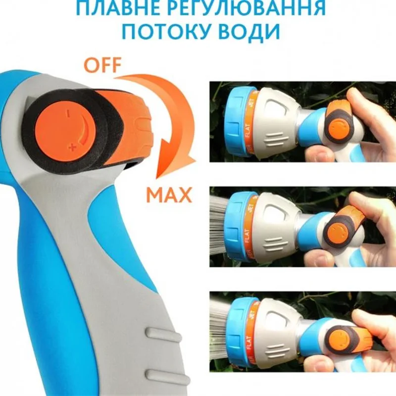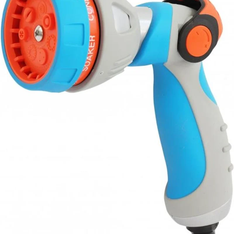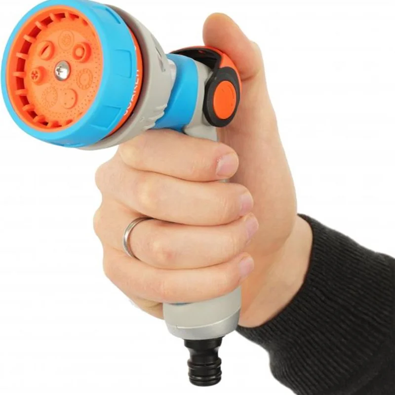 Надійний пістолет призначений для ефективного поливання газону, клумб, чагарників, а також для миття садового інвентарю й техніки, для миття машини, для змивання бруду зі сходинок і доріжок. Пістолет для поливу легко регулює подавання води із 7 типами струменя: від точкового до великого розпилення, що дає змогу виконувати різні типи робіт. Має зручний прогумований кільцевий перемикач режимів поливання та плавне регулювання потоку води; Головка дощувача зроблена зі сталі, ручка — з багатошарового пластику. Корпус має гумове покриття. Прискорює процес поливання садових рослин, допомагає під силою напору змити навіть скам’янілий бруд із садового інвентарю й допомагає впорається з іншими побутовими завданнями на дачній ділянці, у саду.