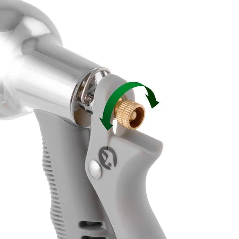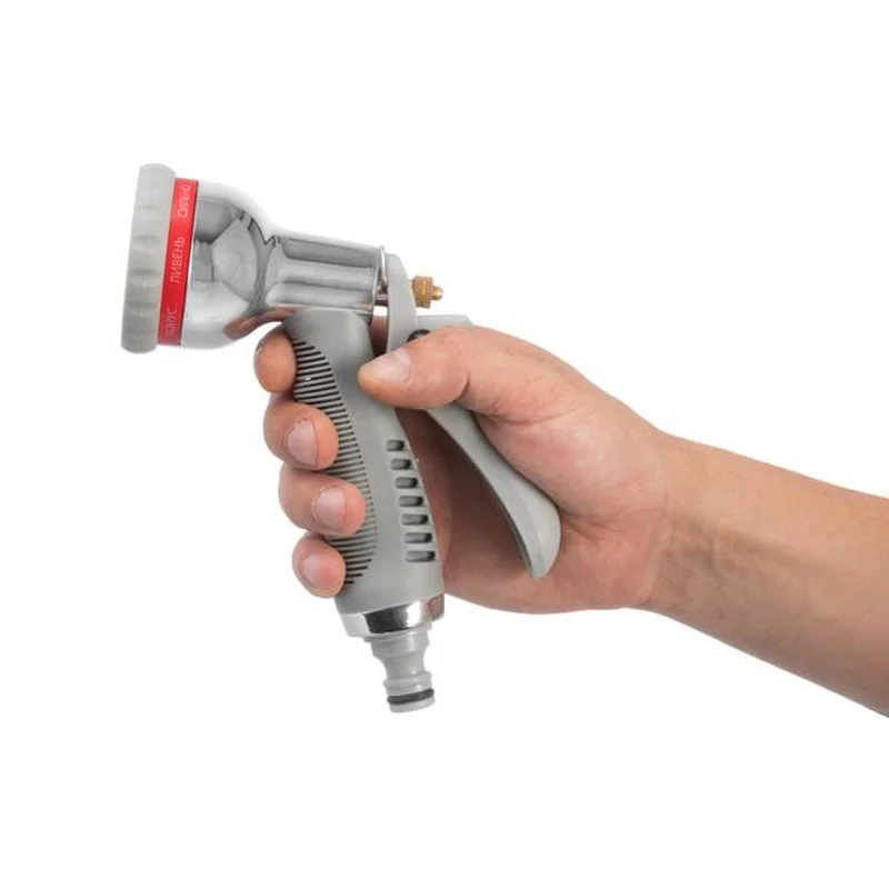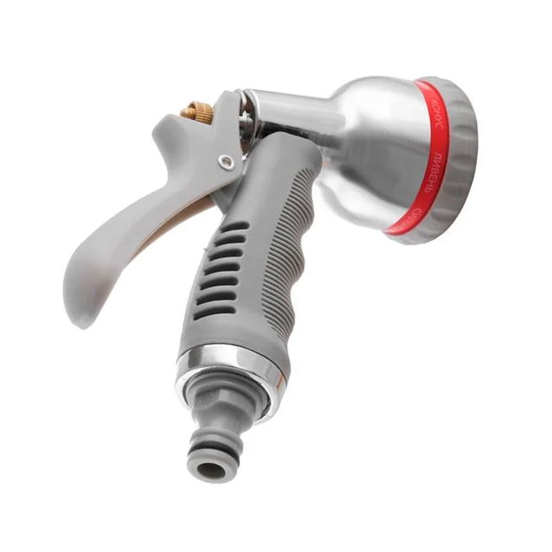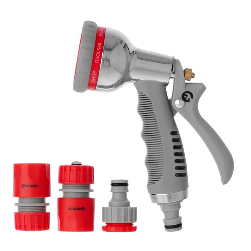 Пістолет-розпилювач для поливу хромований, 8 функцій (центральний, туман, душ, кутовий, повний, злива, конічний, плоский) + адаптер з внут. різьбою 1/2"/3/4", конектор з аквастопом 1/2", конектор 1/2" на шланг INTERTOOL GE-0005