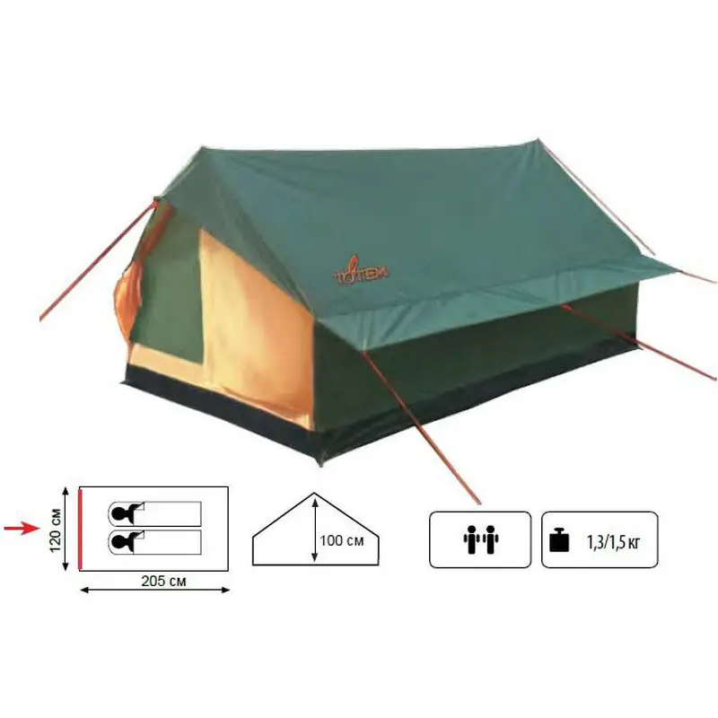 Легкий компактний одношаровий літній двомісний намет конструкції "будиночок" для нетривалих походів вихідного дня, риболовлі та відпочинку на природі.
