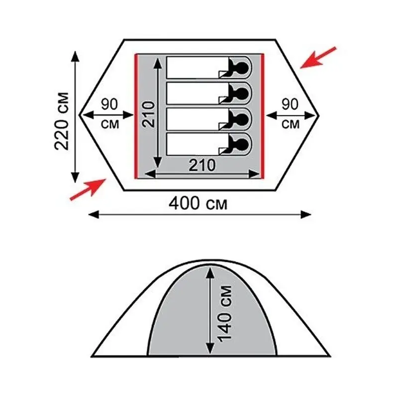 Зовнішні дуги сильніше натягують зовнішній тент, за рахунок чого конденсат швидше скочується по його внутрішній поверхні, не затікає в спальний відсік.