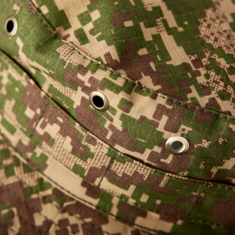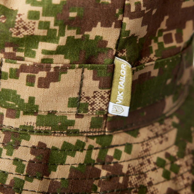 Армійська панама в українському камуфляжі Хижак. Виготовлена з матеріалу Ripstop — така тканина має армуючу нитку у своїй структурі, тому тканина виходить досить міцною, а порізи та подряпини не розходяться по всій площі.
