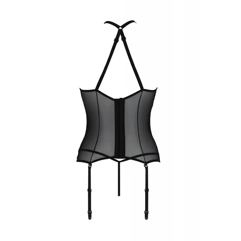Напівпрозорий, еластичний тюль приємний до тіла. У комплекті корсет та стрінги.