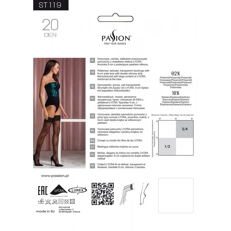 Чуттєва деталь, яка здатна внести сексуальний підтекст у будь-який стиль одягу. Купуйте панчохи Passion ST119 на ажурній силіконовій гумці, одягніть ваші ніжки в нейлонову розкіш. Мереживна широка гумка на двох силіконових стрічках забезпечує надійне кріплення на тілі. Різноманітний орнамент з розсипу квітів з металізованою ниткою та тонкою смужкою під гумкою, що імітує підв'язку, наповнюють образ жіночністю та витонченістю.