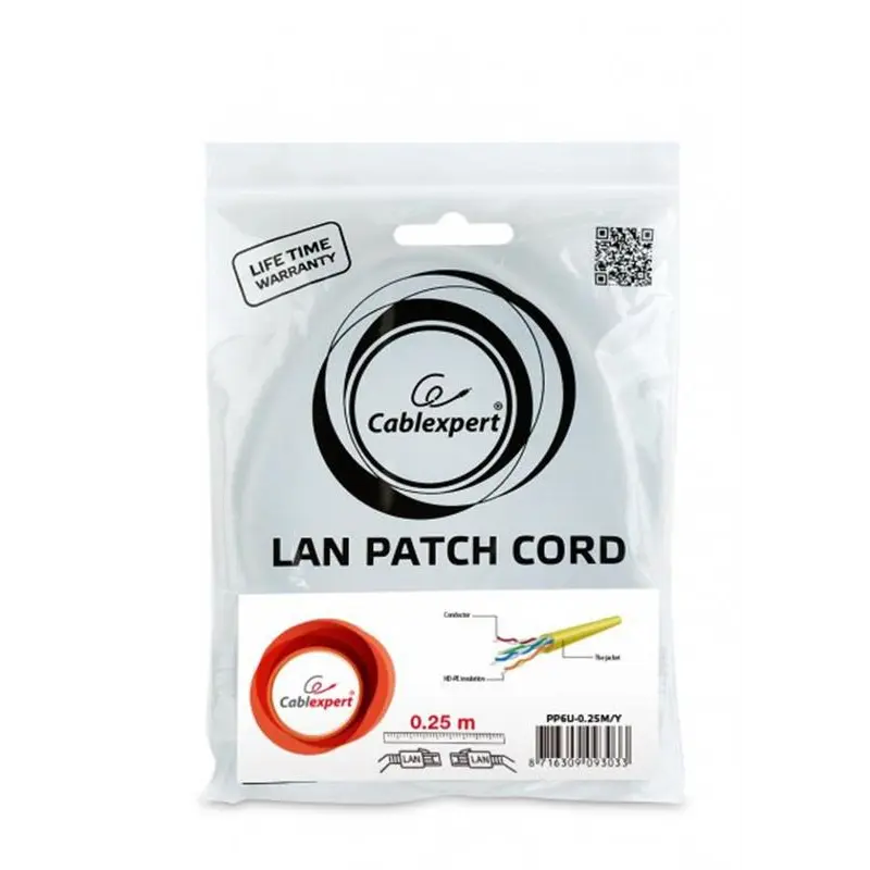 Патч-корд UTP Cablexpert (PP6U-0.25M/Y) cat.6, літий, 50u штекер із засувкою, 0.25 м, жовтий