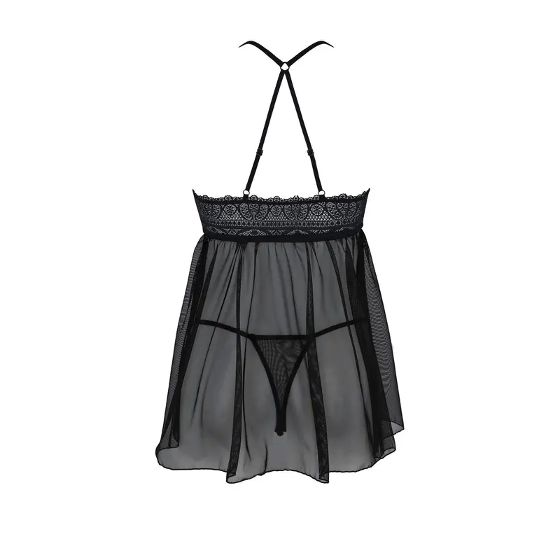 Верх виконаний у вигляді ліфа з трикутними чашками з оксамитового мережива з оригінальним малюнком. Низ — леткий поділ А-силуету довжиною до середини стегна з м’якої на дотик сіточки. Ансамбль довершують стрінги-трикутники — мереживні спереду та сітчасті ззаду.