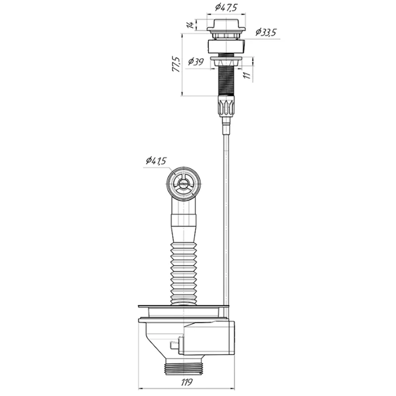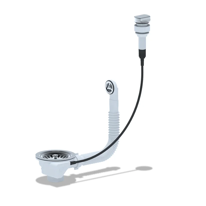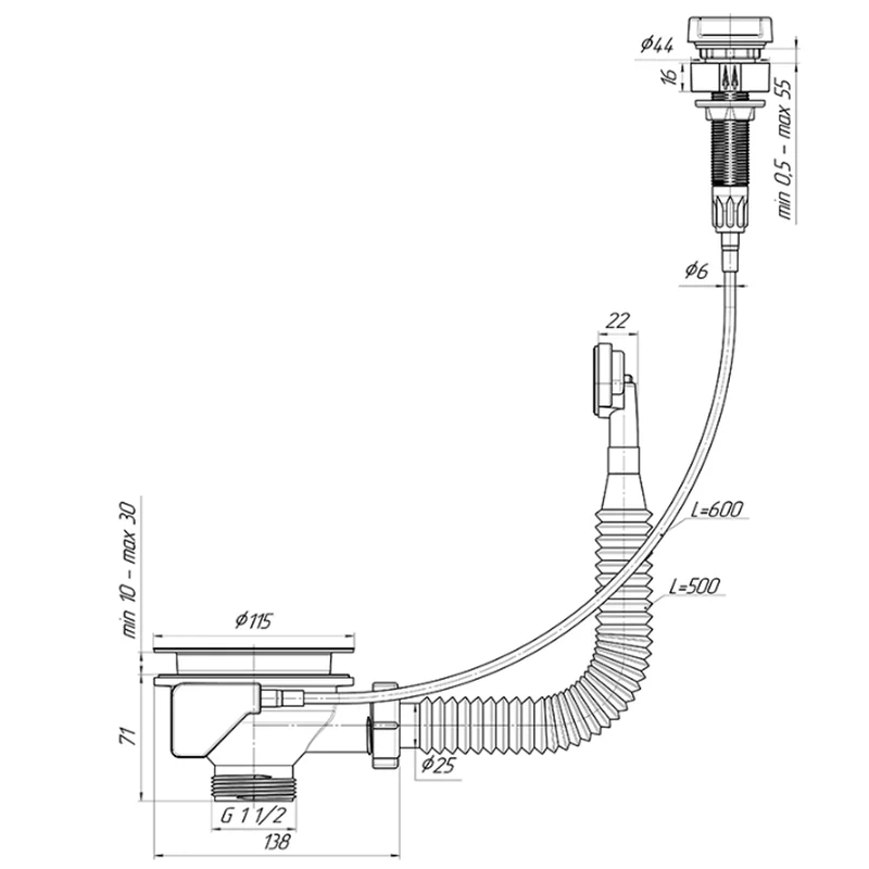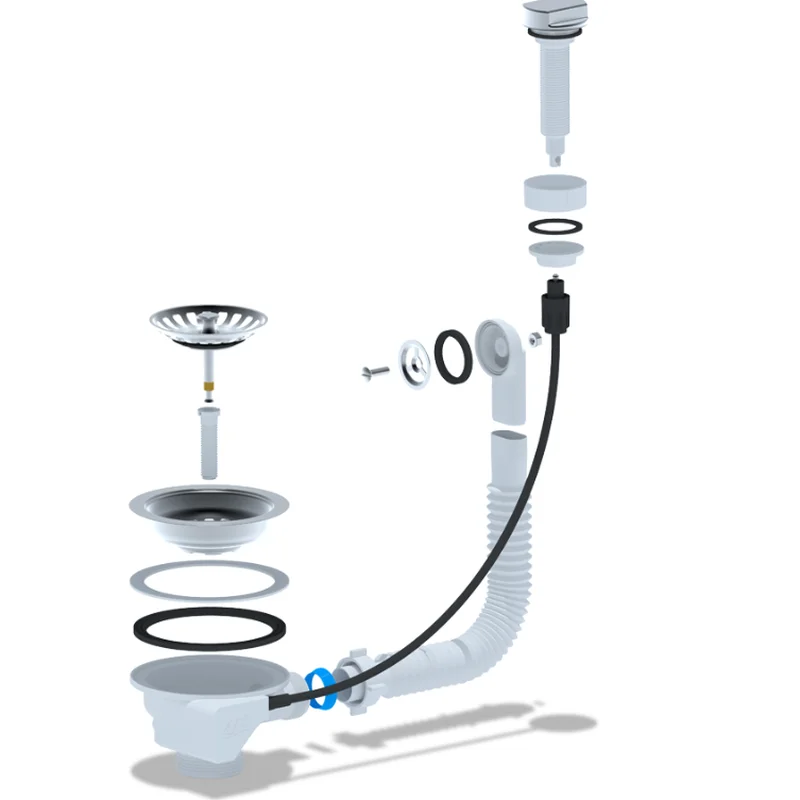 Перелив напівавтомат для мийки з нержавіючою решіткою 115мм і гнучким круглим переливом. Корпус переливу обладнаний універсальною прокладкою для круглих і прямокутних мийок з нержавіючої сталі зі зливним отвором