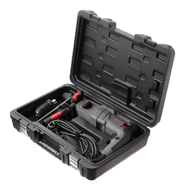 Перфоратор та всі комплектуючі аксесуари запаковані у надійний кейс з додатковими ребрами жорсткості для більшої міцності.