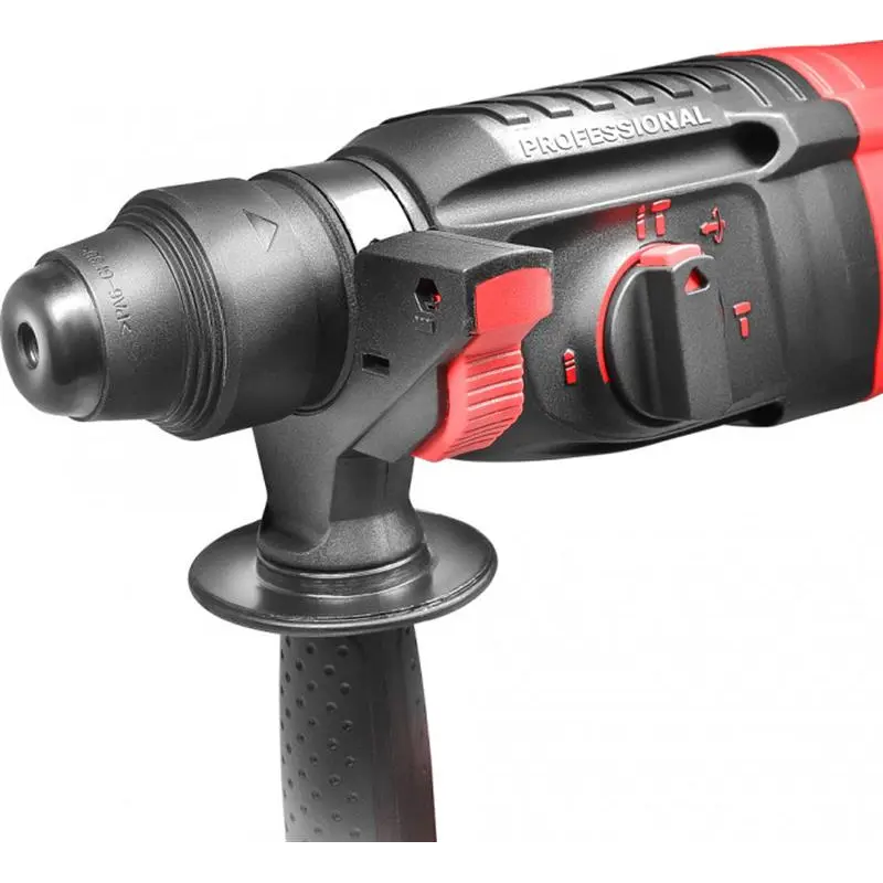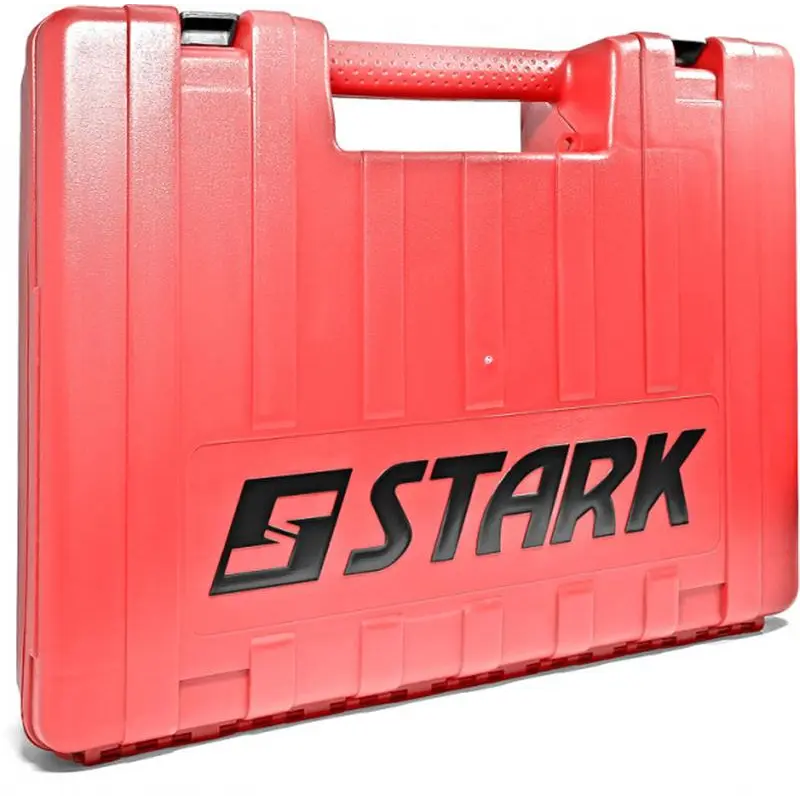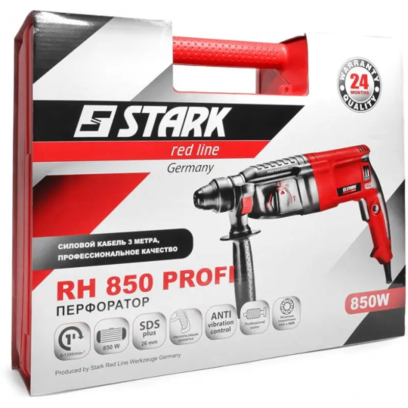 Переваги перфоратора Stark RH-850 Profi: надійні підшипники і редуктор забезпечують довгий термін експлуатації; зручне перемикання режимів за допомогою коліщатка прискорює роботу; рукоятка з гасінням вібрації забезпечує комфортну роботу не дивлячись на силу удару; прогумовані накладки на рукоятках запобігають ковзанню для безпечної роботи інструментом; регулювання швидкості обертання дозволяє ефективно виконувати різні типи робіт від свердління до довбання; професійна система точного свердління дозволяє інструмент використовувати в роботах різної тяжкості; швидкість удару регулюється для якісної роботи по різному типу матеріалу. Перфоратор Stark RH-850 Profi комплектується: бічною рукояткою; глибиноміром; списом; долотом; бурами; кейсом.